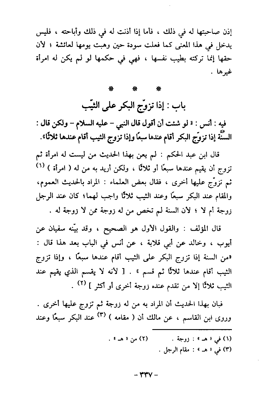 / 100 - فيه: أَنَس، لَوْ شِئْتُ أَنْ أَقُولَ: قَالَ النَّبِىُّ، عَلَيْهِ السَّلام، وَلَكِنْ قَالَ السُّنَّةُ: إِذَا تَزَوَّجَ الْبِكْرَ، أَقَامَ عِنْدَهَا سَبْعًا، وَإِذَا تَزَوَّجَ الثَّيِّبَ، أَقَامَ عِنْدَهَا ثَلاثًا. قال ابن عبد الحكم: لم يعن بهذا الحديث من ليست له امرأة، ثم تزوج أن يقيم عندها سبعًا أو ثلاثًا، ولكن أريد به من له امرأة، ثم تزوج عليها أخرى، فقال بعض العلماء: المراد بالحديث العموم، والمقام عند البكر سبعًا وعند الثيب ثلاثًا واجب لهما، كان عند الرجل زوجة أم لا؛ لأن السنة لم تخص من له زوجة ممن لا زوجة له. قال المؤلف: والقول الأول هو الصحيح، وقد بينه سفيان، عن أيوب، وخالد، عن أبى قلابة، عن أنس فى الباب بعد هذا، قال: من السنة إذا تزوج البكر على الثيب أقام عندها سبعًا، وإذا تزوج الثيب أقام عندها ثلاثًا ثم قسم؛ لأنه لا يقسم الذى يقيم عند الثيب ثلاثًا إلا من تقدم عنده زوجة أخرى أو أكثر. فبان بهذا الحديث أن المراد به من له زوجة ثم تزوج عليها أخرى. وروى ابن القاسم، عن مالك، أن مقامه عند البكر سبعًا، وعند
