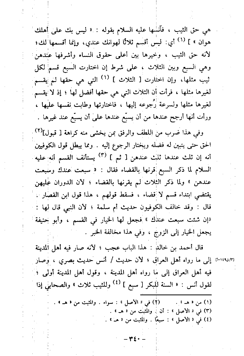 هى حق الثيب، فآنسها عليه السلام بقوله: (ليس بك على أهلك هوان) ، أى ليس أقسم ثلاثًا لهوانك عندى، وإنما أقسمها لك؛ لأنه حق الثيب، وخيرها بين أعلى حقوق النساء وأشرفها عندهن وهى السبع وبين الثلاث، على شرط إن اختارت السبع قسم لكل ثيب مثلها، وإن اختارت الثلاث التى هى حقها لم يقسم لغيرها مثلها، فرأت أن الثلاث التى هى حقها أفضل لها، إذ لا يقسم لغيرها مثلها ولسرعة رجوعه إليها، فاختارتها وطابت نفسها عليها، ورأت أنها أرجح عندها من أن يسبع عندها على أن يسبع عند غيرها. وفى هذا ضرب من اللطف والرفق بمن يخشى منه كراهة قبول الحق حتى يتبين له فضله ويختار الرجوع إليه، ومما يبطل قول الكوفيين أنه إن ثلث عندها ثلث عندهن ثم يستأنف القسم أنه، عليه السلام، لما ذكر السبع قرنها بالقضاء، فقال: (سبعت عندك وسبعت عندهن) ، ولما ذكر الثلاث لم يقرنها بالقضاء؛ لأن الدوران عليهن يقتضى ابتداء قسم لا قضاء، فسقط قولهم، هذا قول ابن القصار. قال: وقد خالف الكوفيون حديث أم سلمة؛ لأن النبى (صلى الله عليه وسلم) قال لها: (إن شئت سبعت عندك) ، فجعل لها الخيار فى القسم، وأبو حنيفة يجعل الخيار إلى الزوج، وفى هذا مخالفة الخبر. قال أحمد بن خالد: هذا الباب عجب؛ لأنه صار فيه أهل المدينة إلى ما رواه أهل العراق؛ لأن حديث أنس حديث بصرى، وصار فيه أهل العراق إلى ما رواه اهل المدينة، وقول أهل المدينة أولى؛ لقول أنس: السنة للبكر سبع، وللثيب ثلاث، والصحابى إذا