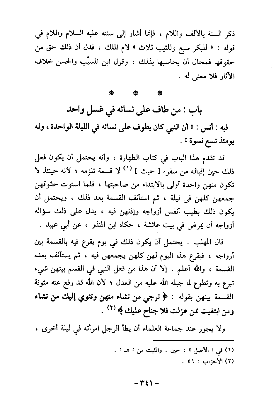 / 102 - فيه: أَنَس، أَنَّ النَّبِىّ (صلى الله عليه وسلم) كَانَ يَطُوفُ عَلَى نِسَائِهِ فِى اللَّيْلَةِ الْوَاحِدَةِ، وَلَهُ يَوْمَئِذٍ تِسْعُ نِسْوَةٍ. قد تقدم هذا الباب فى كتاب الطهارة، وأنه يحتمل أن يكون فعل ذلك حين إقباله من سفره حيث لا قسمة تلزمه؛ لأنه حينئذ لا تكون منهن واحدة أولى بالابتداء من صاحبتها، فلما استوت حقوقهن جمعهن كلهن فى ليلة، ثم استأنف القسمة بعد ذلك، ويحتمل أن يكون ذلك بطيب أنفس أزواجه وإذنهن فيه، يدل على ذلك سؤاله أزواجه أن يمرض فى بيت عائشة، حكاه ابن المنذر، عن أبى عبيد. قال المهلب: يحتمل أن يكون ذلك فى يوم يقرع فيه بالقسمة بين أزواجه، فيقرع هذا اليوم لهن كلهن يجمعهن فيه، ثم يستأنف بعده القسمة، والله أعلم. إلا أن هذا من فعل النبى (صلى الله عليه وسلم) فى القسم بينهن شىء تبرع به وتطوع لما جبله الله عليه من العدل؛ لأن الله قد رفع عنه مئونة القسمة بينهن بقوله: (ترجى من تشاء منهن وتئوى إليك من تشاء ومن ابتغيت ممن عزلت فلا جناح عليك) [الأحزاب: 51] . ولا يجوز عند جماعة العلماء أن يطأ الرجل امرأته فى ليلة أخرى،