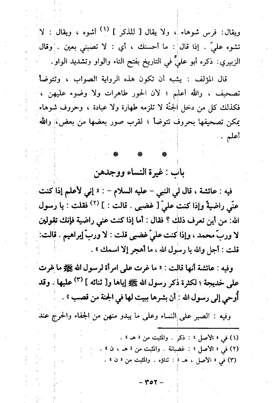ويقال: فرس شوهاء، ولا يقال للذكر أشوه، ويقال: لا تشوه علىّ، إذا قال: ما أحسنك، أى لا تصبنى بعين. وقال الزبيرى: ذكره أبو على فى التاريخ بفتح التاء والواو وتشديد الواو. قال المؤلف: يشبه أن تكون هذه الرواية الصواب، وتتوضأ تصحيف، والله أعلم؛ لأن الحور طاهرات ولا وضوء عليهن، فكذلك كل من دخل الجنة لا تلزمه طهارة ولا عبادة، وحروف شوهاء يمكن تصحيفها بحروف تتوضأ؛ لقرب صور بعضها من بعض، والله أعلم.