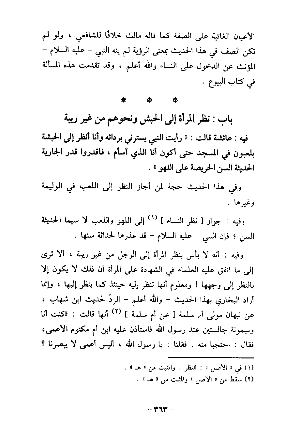 / 123 - فيه: عَائِشَةَ، قَالَتْ: رَأَيْتُ النَّبِىَّ (صلى الله عليه وسلم) يَسْتُرُنِى بِرِدَائِهِ، وَأَنَا أَنْظُرُ إِلَى الْحَبَشَةِ يَلْعَبُونَ فِى الْمَسْجِدِ، حَتَّى أَكُونَ أَنَا الَّتِى أَسْأَمُ، فَاقْدُرُوا قَدْرَ الْجَارِيَةِ الْحَدِيثَةِ السِّنِّ الْحَرِيصَةِ عَلَى اللَّهْوِ. وفى هذا الحديث: حجة لمن أجاز النظر إلى اللعب فى الوليمة وغيرها. وفيه: جواز نظر النساء إلى اللهو واللعب، لاسيما الحديثة السن، فإن النبى عليه السلام قد عذرها لحداثة سنها. وفيه: أنه لا بأس بنظر المرأة إلى الرجل من غير ريبة، ألا ترى إلى ما اتفق عليه العلماء فى الشهادة على المرأة أن ذلك لا يكون إلا بالنظر إلى وجهها، ومعلوم أنها تنظر إليه حينئذ كما ينظر إليها، وإنما أراد البخارى بهذا الحديث، والله أعلم، الرد لحديث ابن شهاب، عن نبهان مولى أم سلمة، عن أم سلمة، أنها قالت: كنت أنا وميمونة جالستين عند رسول الله (صلى الله عليه وسلم) ، فاستأذن عليه ابن أم مكتوم الأعمى، فقال: (احتجبا منه) ، فقلنا: يا رسول الله، أليس أعمى لا يبصرنا؟