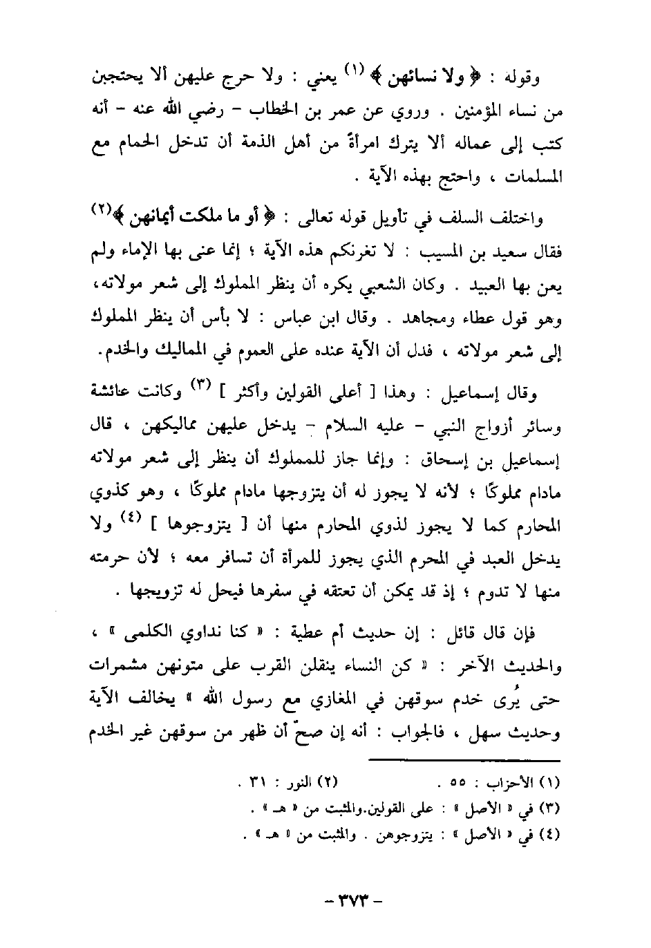 وقوله: (ولا نسائهن) [الأحزاب: 55] ، يعنى ولا حرج عليهن ألا يحتجبن من نساء المؤمنين. وروى عن عمر بن الخطاب، رضى الله عنه، أنه كتب إلى عماله ألا يترك امرأة من أهل الذمة أن تدخل الحمام مع المسلمات، واحتج بهذه الآية. واختلف السلف فى تأويل قوله تعالى: (أو ما ملكت أيمانهن) [النور: 31] ، فقال سعيد بن المسيب: لا تغرنكم هذه الآية، إنما عنى بها الإماء ولم يعن بها العبيد. وكان الشعبى يكره أن ينظر المملوك إلى شعر مولاته، وهو قول عطاء ومجاهد. وقال ابن عباس: لا بأس أن ينظر المملوك إلى شعر مولاته، فدل أن الآية عنده على العموم فى المماليك والخدم. وقال إسماعيل: وهذا أعلى القولين وأكثر، وكانت عائشة وسائر أزواج النبى، عليه السلام، يدخل عليهن مماليكهن، قال إسماعيل بن إسحاق: وإنما جاز للمملوك أن ينظر إلى شعر مولاته مادام مملوكًا؛ لأنه لا يجوز له أن يتزوجها مادام مملوكًا، وهو كذوى المحارم كما لا يجوز لذوى المحارم منها أن يتزوجوها ولا يدخل العبد فى المحرم الذى يجوز للمرأة أن تسافر معه؛ لأن حرمته منها لا تدوم، إذ قد يمكن أن تعتقه فى سفرها فيحل له تزويجها. فإن قال قائل: إن حديث أم عطية: كنا نداوى الكلمى. والحديث الآخر: كن النساء ينقلن القرب على متونهن مشمرات حتى يرى خدم سوقهن فى المغازى مع رسول الله (صلى الله عليه وسلم) ، يخالف الآية وحديث سهل. فالجواب: أنه إن صح أن ظهر من سوقهن غير الخدم