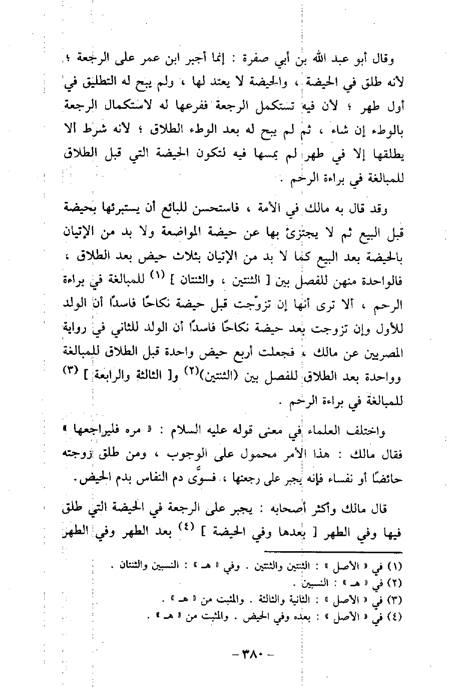 وقال أبو عبد الله بن أبى صفرة: إنما أجبر ابن عمر على الرجعة؛ لأنه طلق فى الحيضة، والحيضة لا يعتد بها، ولم يبح له التطليق فى أول طهر؛ لأن فيه تستكمل الرجعة، ففرعها له لاستكمال الرجعة بالوطء إن شاء، ثم لم يبح له بعد الوطء الطلاق؛ لأنه شرط ألا يطلقها إلا فى طهر لم يمسها فيه لتكون الحيضة التى قبل الطلاق للمبالغة فى براءة الرحم. وقد قال به مالك فى الأمة، فاستحسن للبائع أن يستبرئها بحيضة قبل البيع، ثم لا يجتزئ بها عن حيضة المواضعة، ولابد من الإتيان بالحيضة بعد البيع كما لابد من الإتيان بثلاث حيض بعد الطلاق، فالواحدة منهن للفصل بين الثنتين، والثنتان للمبالغة فى براءة الرحم، ألا ترى أنها إن تزوجت قبل حيضة نكاحًا فاسدًا أن الولد للأول، وإن تزوجت بعد حيضة نكاحًا فاسدًا أن الولد للثانى فى رواية المصريين عن مالك، فجعلت أربع حيض واحدة قبل الطلاق للمبالغة وواحدة بعد الطلاق للفصل بين الثنتين والثالثة والرابعة للمبالغة فى براءة الرحم. واختلف العلماء فى معنى قوله، عليه السلام: (مره فليراجعها) ، فقال مالك: هذا الأمر محمول على الوجوب، ومن طلق زوجته حائضًا أو نفساء، فإنه يجبر على رجعتها، فسوى دم النفاس بدم الحيض. قال مالك وأكثر أصحابه: يجبر على الرجعة فى الحيضة التى طلق فيها، وفى الطهر
