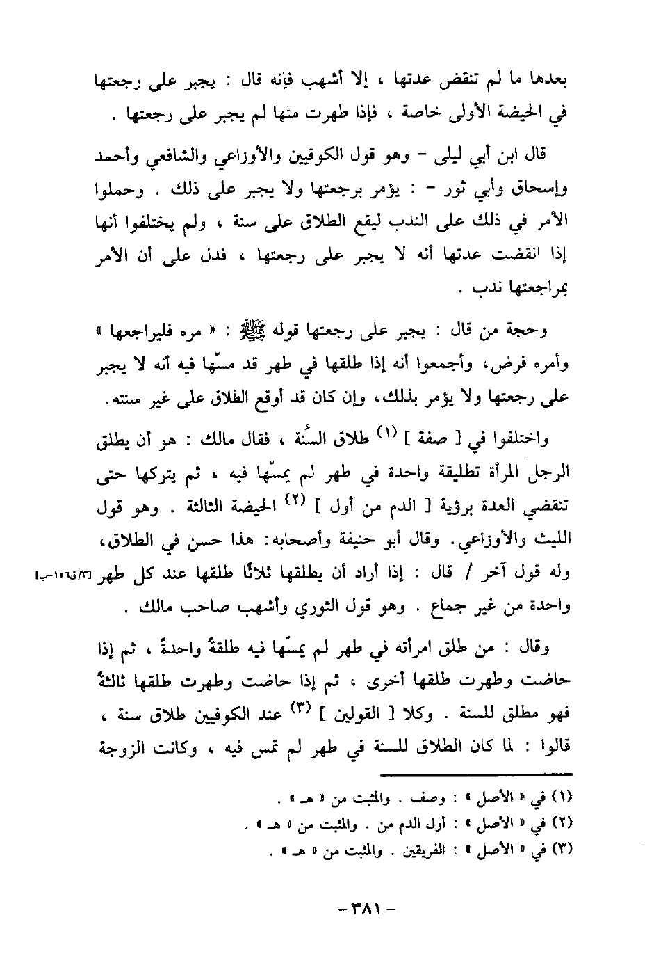 بعدها، وفى الحيضة بعد الطهر، وفى الطهر بعدها ما لم تنقض عدتها، إلا أشهب، فإنه قال: يجبر على رجعتها فى الحيضة الأولى خاصة، فإذا طهرت منها، لم يجبر على رجعتها. قال ابن أبى ليلى، وهو قول الكوفيين، والأوزاعى، والشافعى، وأحمد، وإسحاق، وأبى ثور: يؤمر برجعتها ولا يجبر على ذلك، وحملوا الأمر فى ذلك على الندب ليقع الطلاق على سنة، ولم يختلفوا أنها إذا انقضت عدتها أنه لا يجبر على رجعتها، فدل على أن الأمر بمراجعتها ندب. وحجة من قال: يجبر على رجعتها قوله (صلى الله عليه وسلم) : (مره فليراجعها) ، وأمره فرض، وأجمعوا أنه إذا طلقها فى طهر قد مسها فيه أنه لا يجبر على رجعتها ولا يؤمر بذلك، وإن كان قد أوقع الطلاق على غير سنته. واختلفوا فى صفة طلاق السنة، فقال مالك: هو أن يطلق الرجل المرأة تطليقة واحدة فى طهر لم يمسها فيه، ثم يتركها حتى تنقضى العدة برؤية الدم من أول الحيضة الثالثة، وهو قول الليث، والأوزاعى. وقال أبو حنيفة وأصحابه: هذا حسن فى الطلاق، وله قول آخر، قال: إذا أراد أن يطلقها ثلاثًا طلقها عند كل طهر واحدة من غير جماع، وهو قول الثورى، وأشهب صاحب مالك. وقال: من طلق امرأته فى طهر لم يمسها فيه طلقة واحدة، ثم إذا حاضت وطهرت طلقها أخرى، ثم إذا حاضت وطهرت طلقها ثالثة فهو مطلق للسنة، وكلا القولين عند الكوفيين طلاق سنة، قالوا: لما كان الطلاق للسنة فى طهر لم تمس فيه، وكانت الزوجة