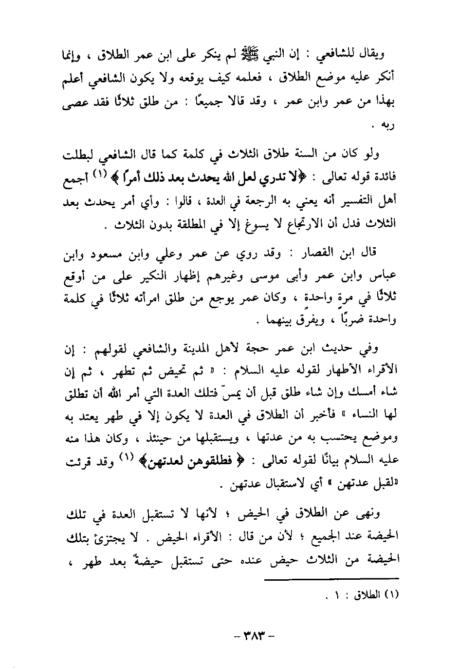 ويقال للشافعى: إن النبى (صلى الله عليه وسلم) لم ينكر على ابن عمر الطلاق، وإنما أنكر عليه موضع الطلاق، فعلمه كيف يوقعه ولا يكون الشافعى أعلم بهذا من عمر وابن عمر، وقد قالا جميعًا: من طلق ثلاثًا فقد عصى ربه. ولو كان من السنة طلاق الثلاث فى كلمة كما قال الشافعى لبطلت فائدة قوله تعالى: (لا تدرى لعل الله يحدث بعد ذلك أمرًا) [الطلاق: 1] ، أجمع أهل التفسير أنه يعنى به الرجعة فى العدة، قالوا: وأى أمر يحدث بعد الثلاث، فدل أن الارتجاع لا يسوغ إلا فى المطلقة بدون الثلاث. قال ابن القصار: وقد روى عن عمر، وعلى، وابن مسعود، وابن عباس، وابن عمر، وأبى موسى وغيرهم، إظهار النكير على من أوقع ثلاثًا فى مرة واحدة، وكان عمر يوجع من طلق امرأته ثلاثًا فى كلمة واحدة ضربًا، ويفرق بينهما. وفى حديث ابن عمر حجة لأهل المدينة والشافعى لقولهم: إن الأقراء الأطهار لقوله عليه السلام: (ثم تحيض، ثم تطهر، ثم إن شاء أمسك، وإن شاء طلق قبل أن يمس، فتلك العدة التى أمر الله أن تطلق لها النساء) ، فأخبر أن الطلاق فى العدة لا يكون إلا فى طهر يعتد به وموضع يحتسب به من عدتها، ويستقبلها من حينئذ، وكان هذا منه، عليه السلام، بيانًا لقوله تعالى: (فطلقوهن لعدتهن) [الطلاق: 1] ، وقد قرئت: لقبل عدتهن، أى لاستقبال عدتهن. ونهى عن الطلاق فى الحيض؛ لأنها لا تستقبل العدة فى تلك الحيضة عند الجميع؛ لأن من قال: الأقراء الحيض، لا يجتزئ بتلك الحيضة من الثلاث حيض عنده حتى تستقبل حيضة بعد طهر،