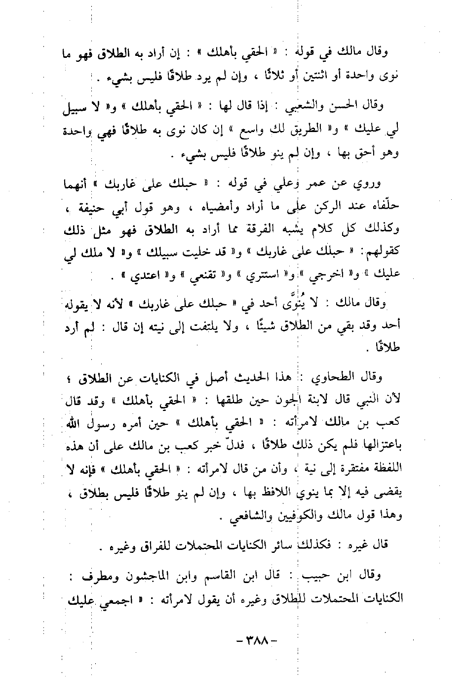 وقال مالك فى قوله: الحقى بأهلك، إن أراد به الطلاق فهو ما نوى واحدة أو اثنتين أو ثلاثًا، وإن لم يرد طلاقًا فليس بشىء. وقال الحسن والشعبى: إذا قال لها: الحقى بأهلك، ولا سبيل لى عليك، والطريق لك واسع، إن كان نوى به طلاقًا فهى واحدة وهو أحق بها، وإن لم ينو طلاقًا فليس بشىء. وروى عن عمر، وعلى فى قوله: حبلك على غاربك، أنهما حلفاه عند الركن على ما أراد وأمضياه، وهو قول أبى حنيفة، وكذلك كل كلام يشبه الفرقة مما أراد به الطلاق، فهو مثل ذلك كقولهم: حبلك على غاربك، وقد خليت سبيلك، ولا ملك لى عليك، واخرجى، واستترى، وتقنعى، واعتدى. وقال مالك: لا ينوى أحد فى: حبلك على غاربك؛ لأنه لا يقوله أحد، وقد بقى من الطلاق شيئًا، ولا يلتفت إلى نيته إن قال: لم أرد طلاقًا. وقال الطحاوى: هذا الحديث أصل فى الكنايات عن الطلاق؛ لأن النبى (صلى الله عليه وسلم) قال لابنة الجون حين طلقها: الحقى بأهلك، وقد قال كعب بن مالك لامرأته: الحقى بأهلك، حين أمره رسول الله (صلى الله عليه وسلم) باعتزالها، فلم يكن ذلك طلاقًا، فدل خبر كعب بن مالك على أن هذه اللفظة مفتقرة إلى نية، وأن من قال لامرأته: الحقى بأهلك، فإنه لا يقضى فيه إلا بما ينوى اللافظ بها، وإن لم ينو طلاقًا فليس بطلاق، وهذا قول مالك، والكوفيين، والشافعى. قال غيره: فكذلك سائر الكنايات المحتملات للفراق وغيره. وقال ابن حبيب: قال ابن القاسم، وابن الماجشون، ومطرف: الكنايات المحتملات للطلاق وغيره أن يقول لامرأته: اجمعى عليك