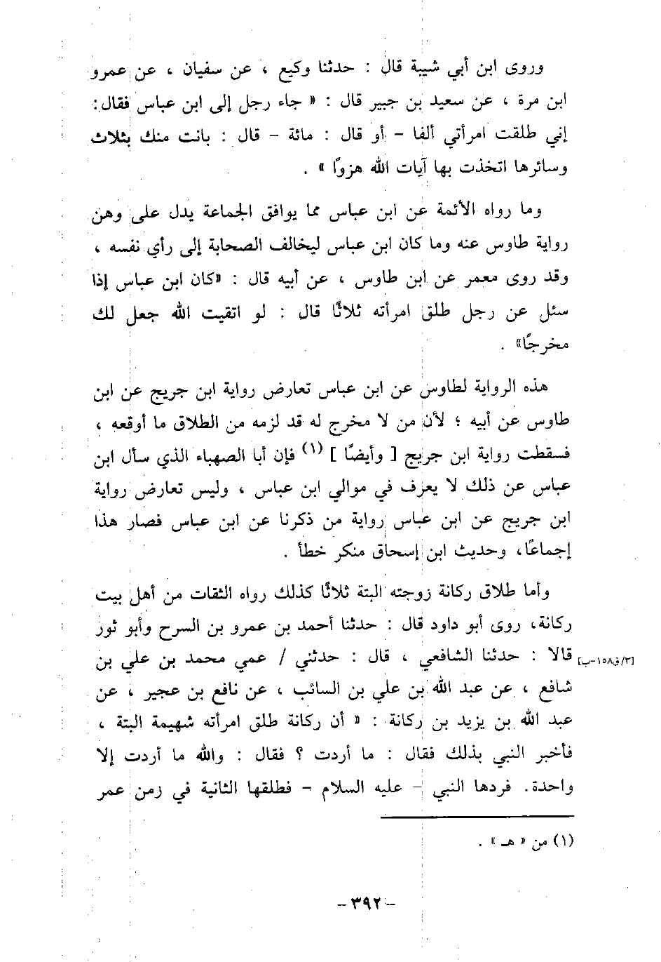 وروى ابن أبى شيبة، قال: حدثنا وكيع، عن سفيان، عن عمرو بن مرة، عن سعيد ابن جبير، قال: جاء رجل إلى ابن عباس، فقال: إنى طلقت امرأتى ألفًا، أو قال: مائة، قال: بانت منك بثلاث، وسائرها اتخذت بها آيات الله هزوًا. وما رواه الأئمة عن ابن عباس مما يوافق الجماعة يدل على وهن رواية طاوس عنه، وما كان ابن عباس ليخالف الصحابة إلى رأى نفسه، وقد روى معمر، عن ابن طاوس، عن أبيه، قال: كان ابن عباس إذا سُئل عن رجل طلق امرأته ثلاثًا، قال: لو اتقيت الله جعل لك مخرجًا. هذه الرواية لطاوس، عن ابن عباس تعارض رواية ابن جريج، عن ابن طاوس، عن أبيه؛ لأن من لا مخرج له قد لزمه من الطلاق ما أوقعه، فسقطت رواية ابن جريج، وأيضًا فإن أبا الصهباء الذى سأل ابن عباس عن ذلك لا يعرف فى موالى ابن عباس، وليس تعارض رواية ابن جريج، عن ابن عباس رواية من ذكرنا عن ابن عباس، فصار هذا إجماعًا، وحديث ابن إسحاق منكر خطأ. وأما طلاق ركانة زوجته البتة ثلاثًا، كذلك رواه الثقات من أهل بيت ركانة، روى أبو داود، قال: حدثنا أحمد بن عمرو بن السرح، وأبو ثور، قالا: حدثنا الشافعى، قال: حدثنى عمى محمد بن على بن شافع، عن عبد الله بن على بن السائب، عن نافع بن عجير، عن عبد الله بن يزيد بن ركانة، أن ركانة طلق امرأته شهيمة البتة، فأخبر النبى (صلى الله عليه وسلم) بذلك، فقال: (ما أردت؟) ، فقال: والله ما أردت إلا واحدة، فردها النبى، عليه السلام، فطلقها الثانية فى زمن عمر،