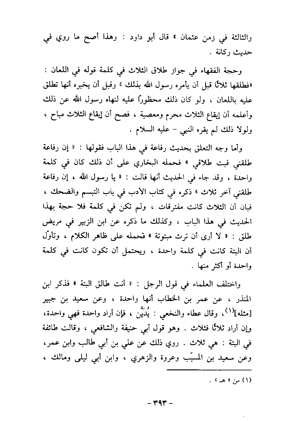 والثالثة فى زمن عثمان. قال أبو داود: وهذا أصح ما روى فى حديث ركانة. وحجة الفقهاء فى جواز طلاق الثلاث فى كلمة قوله فى اللعان: فطلقها ثلاثًا قبل أن يأمره رسول الله (صلى الله عليه وسلم) بذلك، وقبل أن يخبره أنها تطلق عليه باللعان، ولو كان ذلك محظورًا عليه لنهاه رسول الله (صلى الله عليه وسلم) عن ذلك، وأعلمه أن إيقاع الثلاث محرم ومعصية، فصح أن إيقاع الثلاث مباح، ولولا ذلك لم يقره النبى، عليه السلام. وأما وجه التعلق بحديث رفاعة فى هذا الباب، فقولها: إن رفاعة طلقنى فبت طلاقى، فحمله البخارى على أن ذلك كان فى كلمة واحدة، وقد جاء فى الحديث أنها قالت: يا رسول الله، إن رفاعة طلقنى آخر ثلاث، ذكره فى كتاب الأدب فى باب التبسم والضحك، فبان أن الثلاث كانت مفترقات، ولم تكن فى كلمة، فلا حجة بهذا الحديث فى هذا الباب، وكذلك ما ذكره عن ابن الزبير فى مريض طلق: لا أرى أن ترث مبتوتة، فحمله على ظاهر الكلام، وتأول أن البتة كانت فى كلمة واحدة، ويحتمل أن تكون كانت فى كلمة واحدة أو أكثر منها. واختلف العلماء فى قول الرجل: أنت طالق البتة، فذكر ابن المنذر، عن عمر بن الخطاب أنها واحدة، وعن سعيد بن جبير مثله. وقال عطاء، والنخعى: يدين، فإن أراد واحدة فهى واحدة، وإن أراد ثلاثًا فثلاث، وهو قول أبى حنيفة، والشافعى. وقالت طائفة فى البتة: هى ثلاث، روى ذلك عن على بن أبى طالب، وابن عمر، وعن سعيد ابن المسيب، وعروة، والزهرى، وابن أبى ليلى، ومالك،