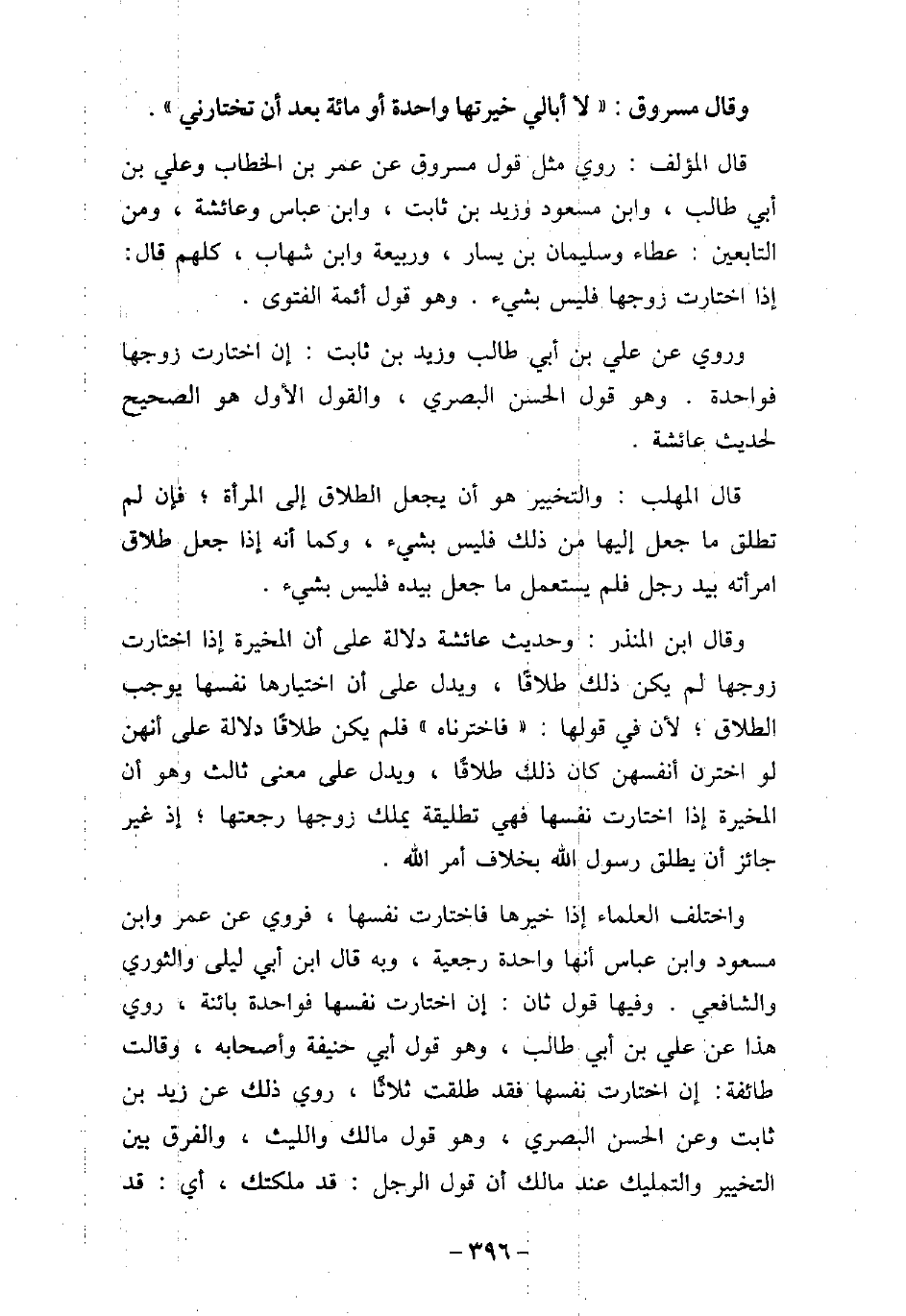 وَقَالَ مَسْرُوقٌ: لا أُبَالِى خَيَّرْتُهَا وَاحِدَةً أَوْ مِائَةً بَعْدَ أَنْ تَخْتَارَنِى. قال المؤلف: روى مثل قول مسروق عن عمر بن الخطاب، وعلى بن أبى طالب، وابن مسعود، وزيد بن ثابت، وابن عباس، وعائشة، ومن التابعين عطاء، وسليمان بن يسار، وربيعة، وابن شهاب، كلهم قال: إذا اختارت زوجها فليس بشىء، وهو قول أئمة الفتوى. وروى عن على بن أبى طالب، وزيد بن ثابت: إن اختارت زوجها فواحدة، وهو قول الحسن البصرى، والقول الأول هو الصحيح لحديث عائشة. قال المهلب: والتخيير هو أن يجعل الطلاق إلى المرأة، فإن لم تطلق ما جعل إليها من ذلك، فليس بشىء، وكما أنه إذا جعل طلاق امرأته بيد رجل، فلم يستعمل ما جعل بيده فليس بشىء. وقال ابن المنذر: وحديث عائشة دلالة على أن المخيرة إذا اختارت زوجها لم يكن ذلك طلاقًا، ويدل على أن اختيارها نفسها يوجب الطلاق؛ لأن فى قولها: فاخترناه، فلم يكن طلاقًا دلالة على أنهن لو اخترن أنفسهن كان ذلك طلاقًا، ويدل على معنى ثالث وهو أن المخيرة إذا اختارت نفسها، فهى تطليقة يملك زوجها رجعتها، إذ غير جائز أن يطلق رسول الله (صلى الله عليه وسلم) بخلاف أمر الله. واختلف العلماء إذا خيرها فاختارت نفسها، فروى عن عمر، وابن مسعود، وابن عباس، أنها واحدة رجعية، وبه قال ابن أبى ليلى، والثورى، والشافعى، وفيها قول ثان: إن اختارت نفسها فواحدة بائنة، روى هذا عن على بن أبى طالب، وهو قول أبى حنيفة وأصحابه، وقالت طائفة: إن اختارت نفسها فقد طلقت ثلاثًا، روى ذلك عن زيد بن ثابت، وعن الحسن البصرى، وهو قول مالك، والليث، والفرق بين التخيير والتمليك عند مالك أن قول الرجل: قد ملكتك، أى قد