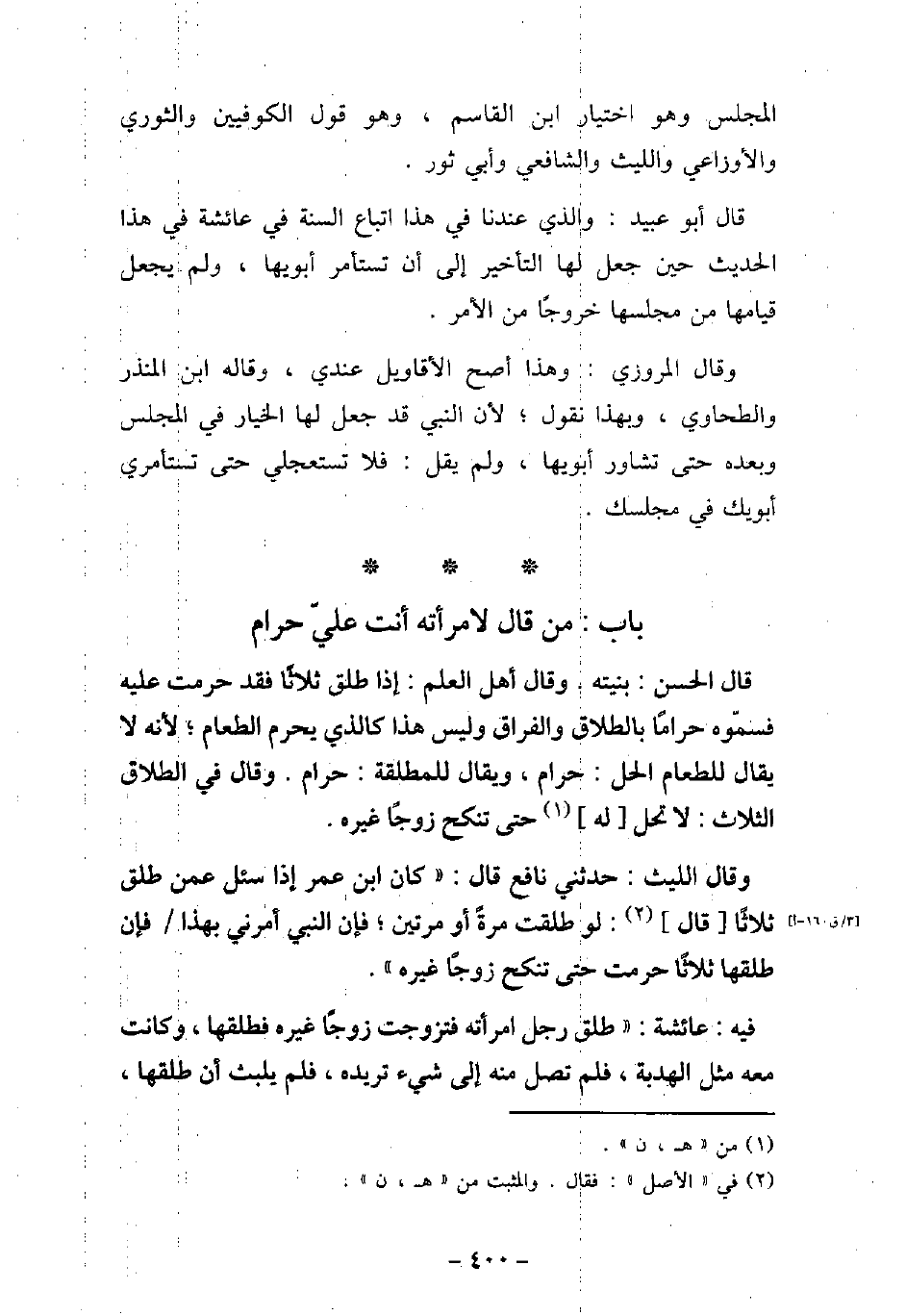 قَالَ الْحَسَنُ: بنِيَّتُهُ، وَقَالَ أَهْلُ الْعِلْمِ: إِذَا طَلَّقَ ثَلاثًا فَقَدْ حَرُمَتْ عَلَيْهِ فَسَمَّوْهُ حَرَامًا بِالطَّلاقِ وَالْفِرَاقِ وَلَيْسَ هَذَا كَالَّذِى يُحَرِّمُ الطَّعَامَ؛ لأنَّهُ لا يُقَالُ لِلطَعَامِ الْحِلِّ: حَرَامٌ، وَيُقَالُ لِلْمُطَلَّقَةِ: حَرَامٌ، وَقَالَ فِى الطَّلاقِ ثَلاثًا: لا تَحِلُّ لَهُ حَتَّى تَنْكِحَ زَوْجًا غَيْرَهُ. وَقَالَ اللَّيْثُ: حَدَّثَنِى نَافِعٌ، قَالَ: كَانَ ابْنُ عُمَرَ إِذَا سُئِلَ عَمَّنْ طَلَّقَ ثَلاثًا، قَالَ: لَوْ طَلَّقْتَ مَرَّةً أَوْ مَرَّتَيْنِ، فَإِنَّ النَّبِىَّ (صلى الله عليه وسلم) أَمَرَنِى بِهَذَا، فَإِنْ طَلَّقْتَهَا ثَلاثًا حَرُمَتْ حَتَّى تَنْكِحَ زَوْجًا غَيْرَهُ. / 10 - فيه: عَائِشَةَ، طَلَّقَ رَجُلٌ امْرَأَتَهُ فَتَزَوَّجَتْ زَوْجًا غَيْرَهُ، فَطَلَّقَهَا وَكَانَتْ مَعَهُ مِثْلُ الْهُدْبَةِ، فَلَمْ تَصِلْ مِنْهُ إِلَى شَىْءٍ تُرِيدُهُ، فَلَمْ يَلْبَثْ أَنْ طَلَّقَهَا،