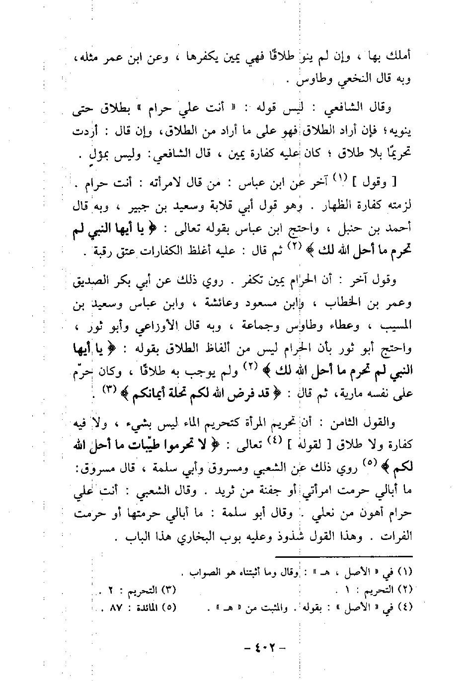 أملك بها، وإن لم ينو طلاقًا فهى يمين يكفرها، وعن ابن عمر مثله، وبه قال النخعى وطاوس. وقال الشافعى: ليس قوله: أنت علىّ حرام، بطلاق حتى ينويه، فإن أراد الطلاق فهو على ما أراد من الطلاق، وإن قال: أردت تحريمًا بلا طلاق، كان عليه كفارة يمين. قال الشافعى: وليس بمؤل. وقول آخر عن ابن عباس: من قال لامرأته: أنت حرام، لزمته كفارة الظهار، وهو قول أبى قلابة، وسعيد بن جبير، وبه قال أحمد بن حنبل، واحتج ابن عباس بقوله تعالى: (يا أيها النبى لم تحرم ما أحل الله لك) [التحريم: 1] ، ثم قال: عليه أغلظ الكفارات عتق رقبة. وقول آخر: أن الحرام يمين تكفر، روى ذلك عن أبى بكر الصديق، وعمر بن الخطاب، وابن مسعود، وعائشة، وابن عباس، وسعيد بن المسيب، وعطاء، وطاوس، وجماعة، وبه قال الأوزاعى، وأبو ثور، واحتج أبو ثور بأن الحرام ليس من ألفاظ الطلاق بقوله: (يا أيها النبى لما تحرم ما أحل الله لك) [التحريم: 1] ، ولم يوجب به طلاقًا، وكان حرم على نفسه مارية، ثم قال: (قد فرض الله لكم تحلة أيمانكم) [التحريم: 2] . والقول الثامن: أن تحريم المرأة كتحريم الماء ليس بشىء، ولا فيه كفارة ولا طلاق؛ لقوله تعالى: (لا تحرموا طيبات ما أحل الله لكم) [المائدة: 87] ، روى ذلك عن الشعبى، ومسروق، وأبى سلمة. قال مسروق: ما أبالى حرمت امرأتى أو جفنة من ثريد. وقال الشعبى: أنت علىّ حرام أهون من نعلى. وقال أبو سلمة: ما أبالى حرمتها أو حرمت الفرات، وهذا القول شذوذ، وعليه بوب البخارى هذا الباب.
