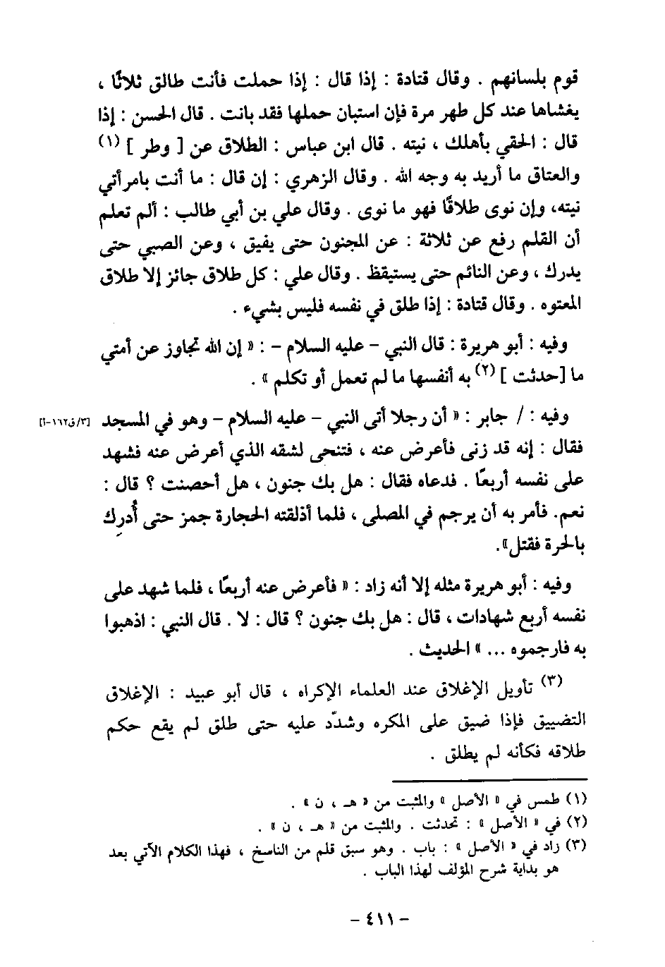قَوْمٍ بِلِسَانهِمْ. وَقَالَ قَتَادَةُ: إِذَا قَالَ: إِذَا حَمَلْتِ فَأَنْتِ طَالِقٌ ثَلاثًا، يَغْشَاهَا عِنْدَ كُلِّ طُهْرٍ مَرَّةً، فَإِنِ اسْتَبَانَ حَمْلُهَا، فَقَدْ بَانَتْ مِنْهُ. وَقَالَ الْحَسَنُ: إِذَا قَالَ: الْحَقِى بِأَهْلِكِ نِيَّتُهُ. قَالَ ابْنُ عَبَّاسٍ: الطَّلاقُ عَنْ وَطَرٍ، وَالْعَتَاقُ مَا أُرِيدَ بِهِ وَجْهُ اللَّهِ. وَقَالَ الزُّهْرِىُّ: إِنْ قَالَ مَا أَنْتِ بِامْرَأَتِى نِيَّتُهُ، وَإِنْ نَوَى طَلاقًا فَهُوَ مَا نَوَى. وَقَالَ عَلِىٌّ بْنِ أَبِى طَالِبٍ: أَلَمْ تَعْلَمْ أَنَّ الْقَلَمَ رُفِعَ عَنْ ثَلاثَةٍ: عَنِ الْمَجْنُونِ حَتَّى يُفِيقَ، وَعَنِ الصَّبِىِّ حَتَّى يُدْرِكَ، وَعَنِ النَّائِمِ حَتَّى يَسْتَيْقِظَ. وَقَالَ عَلِىٌّ: كُلُّ طَّلاقِ جَائِزٌ إِلا طَلاقَ الْمَعْتُوهِ. وَقَالَ قَتَادَة: إِذَا طَلَّقَ فِى نَفْسِهِ فَلَيْسَ بِشَىْءٍ. / 13 - وفيه: أَبُو هُرَيْرَةَ، قَالَ النَّبِىّ، عَلَيْهِ السَّلام: (إِنَّ اللَّهَ تَجَاوَزَ عَنْ أُمَّتِى مَا حَدَّثَتْ بِهِ أَنْفُسَهَا، مَا لَمْ تَعْمَلْ أَوْ تَتَكَلَّمْ) . / 14 - وفيه: جَابِر، أَنَّ رَجُلا أَتَى النَّبِىَّ، عَلَيْهِ السَّلام، وَهُوَ فِى الْمَسْجِدِ، فَقَالَ: إِنَّهُ قَدْ زَنَى، فَأَعْرَضَ عَنْهُ فَتَنَحَّى لِشِقِّهِ الَّذِى أَعْرَضَ عنه فَشَهِدَ عَلَى نَفْسِهِ أَرْبَعًا، فَدَعَاهُ، فَقَالَ: (هَلْ بِكَ جُنُونٌ؟ هَلْ أَحْصَنْتَ) ؟ قَالَ: نَعَمْ، فَأَمَرَ بِهِ أَنْ يُرْجَمَ بِالْمُصَلَّى، فَلَمَّا أَذْلَقَتْهُ الْحِجَارَةُ جَمَزَ حَتَّى أُدْرِكَ بِالْحَرَّةِ فَقُتِلَ. / 15 - وفيه: أَبُو هُرَيْرَةَ مثله، إلا أنه زاد: فَأَعْرَضَ عَنْهُ أربعًا، فَلَمَّا شَهِدَ عَلَى نَفْسِهِ أَرْبَعَ شَهَادَاتٍ، فَقَالَ: (هَلْ بِكَ جُنُونٌ) ؟ قَالَ: لا، فَقَالَ النَّبِىُّ (صلى الله عليه وسلم) : (اذْهَبُوا بِهِ فَارْجُمُوهُ. . .) الحديث. تأويل الإغلاق عند العلماء الإكراه، قال أبو عبيد: الإغلاق التضييق، فإذا ضيق على المكره وشدد عليه حتى طلق لم يقع حكم طلاقه، فكأنه لم يطلق.