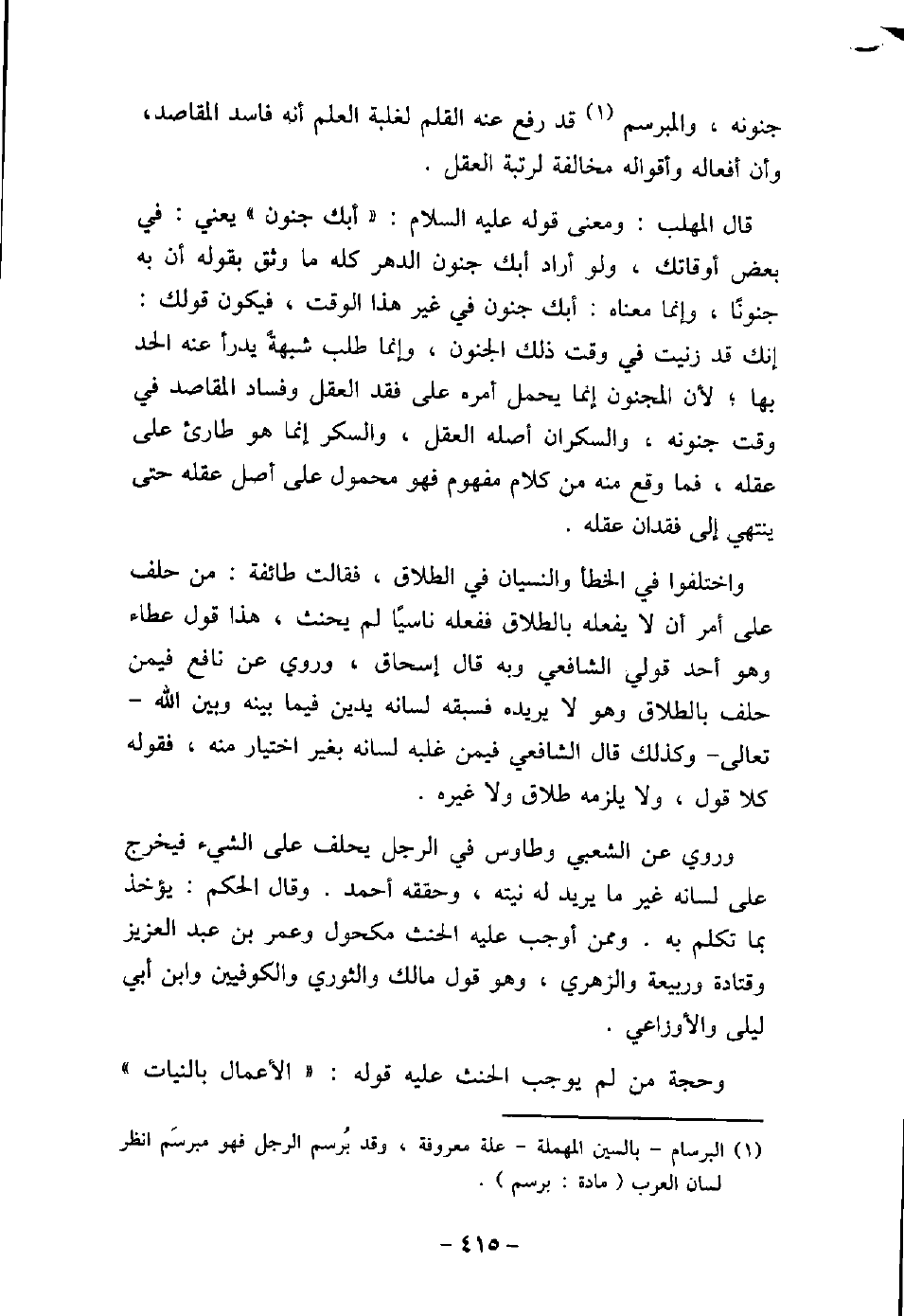 جنونه، والمبرسم قد رفع عنه القلم لغلبة العلم أنه فاسد المقاصد، وأن أفعاله وأقواله مخالفة لرتبة العقل. قال المهلب: ومعنى قوله عليه السلام: (أبك جنون) ، يعنى فى بعض أوقاتك، ولو أراد أبك جنون الدهر كله ما وثق بقوله أن به جنونًا، وإنما معناه أبك جنون فى غير هذا الوقت، فيكون قولك: إنك قد زنيت فى وقت ذلك الجنون، وإنما طلب شبهة يدرأ عنه الحد بها؛ لأن المجنون إنما يحمل أمره على فقد العقل وفساد المقاصد فى وقت جنونه، والسكران أصله العقل، والسكر إنما هو طارئ على عقله، فما وقع منه من كلام مفهوم فهو محمول على أصل عقله حتى ينتهى إلى فقدان عقله. واختلفوا فى الخطأ والنسيان فى الطلاق، فقالت طائفة: من حلف على أمر أن لا يفعله بالطلاق ففعله ناسيًا لم يحنث، هذا قول عطاء، وهو أحد قولى الشافعى، وبه قال إسحاق، وروى عن نافع فيمن حلف بالطلاق وهو لا يريده فسبقه لسانه يدين فيما بينه وبين الله تعالى، وكذلك قال الشافعى فيمن غلبه لسانه بغير اختيار منه، فقوله كلا قول، ولا يلزمه طلاق ولا غيره. وروى عن الشعبى، وطاوس فى الرجل يحلف على الشىء، فيخرج على لسانه غير ما يريد له نيته، وحققه أحمد. وقال الحكم: يؤخذ بما تكلم به، وممن أوجب عليه الحنث مكحول، وعمر بن عبد العزيز، وقتادة، وربيعة، والزهرى، وهو قول مالك، والثورى، والكوفيين، وابن أبى ليلى، والأوزاعى. وحجة من لم يوجب الحنث عليه قوله: (الأعمال بالنيات) ،