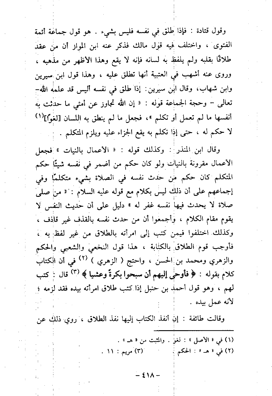 وقول قتادة: فإذا طلق فى نفسه فليس بشىء، هو قول جماعة أئمة الفتوى، واختلف فيه قول مالك، فذكر عنه ابن المواز أن من عقد طلاقًا بقلبه ولم يلفظ به لسانه فإنه لا يقع، وهذا الأظهر من مذهبه، وروى عنه أشهب فى العتبية أنها تطلق عليه، وهذا قول ابن سيرين وابن شهاب، وقال ابن سيرين: إذا طلق فى نفسه أليس قد علمه الله تعالى، وحجة الجماعة قوله: (إن الله تجاوز عن أمتى ما حدثت به أنفسها ما لم تعمل أو تكلم) ، فجعل ما لم ينطق به اللسان لغوًا لا حكم له، حتى إذا تكلم به يقع الجزاء عليه ويلزم المتكلم. وقال ابن المنذر: وكذلك قوله: (الأعمال بالنيات) ، فجعل الأعمال مقرونة بالنيات، ولو كان حكم من أضمر فى نفسه شيئًا حكم المتكلم، كان حكم من حدث نفسه فى الصلاة بشىء متكلمًا، وفى إجماعهم على أن ذلك ليس بكلام مع قوله، عليه السلام: (من صلى صلاة لا يحدث فيها نفسه غفر له) ، دليل على أن حديث النفس لا يقوم مقام الكلام، وأجمعوا أن من حدث نفسه بالقذف غير قاذف، وكذلك اختلفوا فيمن كتب إلى امرأته بالطلاق من غير لفظ به، فأوجب قوم الطلاق بالكتابة، هذا قول النخعى، والشعبى، والحكم، والزهرى، ومحمد بن الحسن، واحتج الزهرى فى أن الكتاب كلام بقوله: (فأوحى إليهم أن سبحوا بكرة وعشيا) [مريم: 11] ، قال: كتب لهم، وهو قول أحمد بن حنبل إذا كتب طلاق امرأته بيده فقد لزمه؛ لأنه عمل بيده. وقالت طائفة: إن أنفذ الكتاب إليها نفذ الطلاق، روى ذلك عن