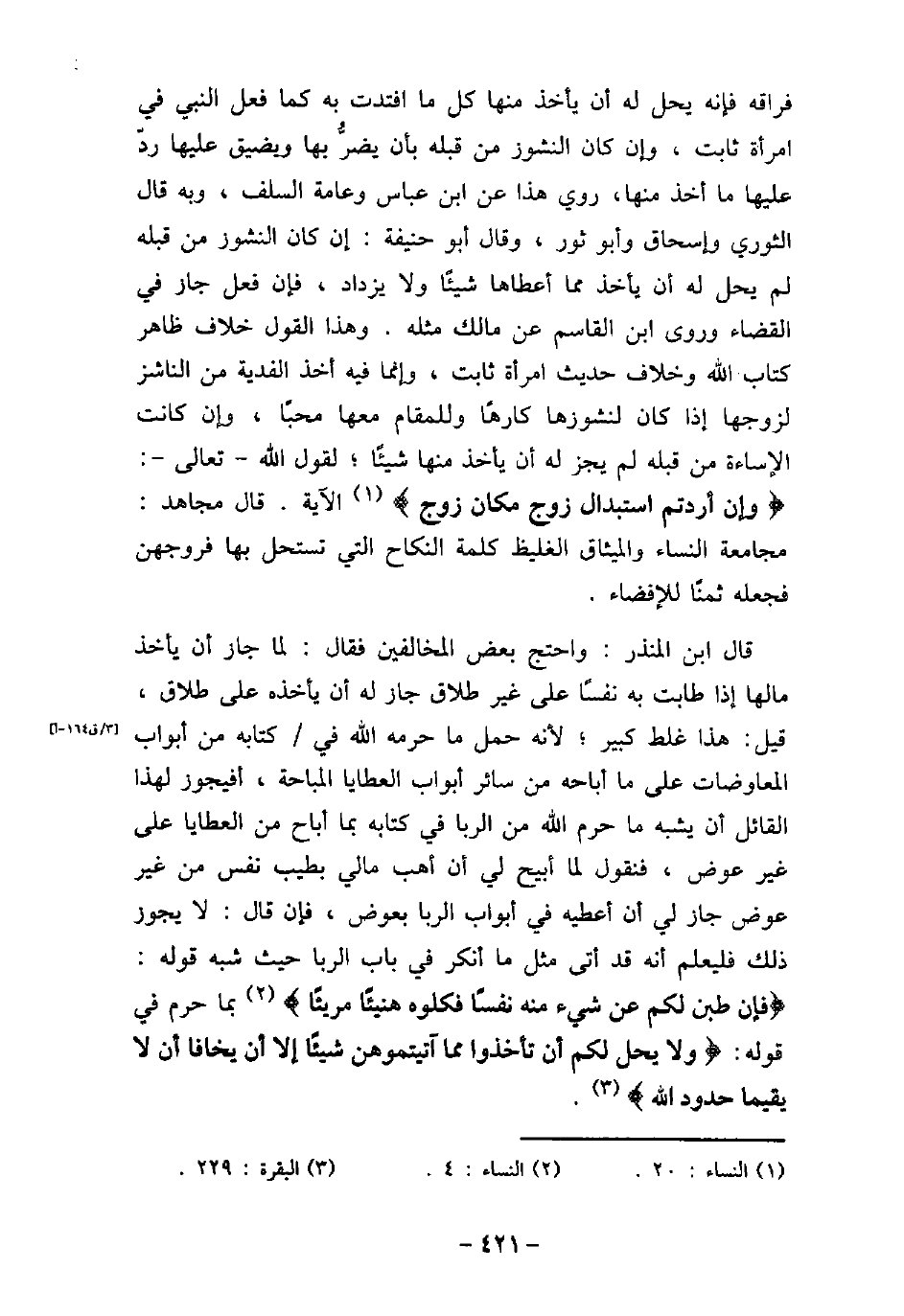 فراقه، فإنه يحل له أن يأخذ منها كل ما افتدت به، كما فعل النبى (صلى الله عليه وسلم) فى امرأة ثابت، وإن كان النشوز من قبله بأن يضر بها ويضيق عليها رد عليها ما أخذ منها، روى هذا عن ابن عباس، وعامة السلف، وبه قال الثورى، وإسحاق، وأبو ثور. وقال أبو حنيفة: إن كان النشوز من قبله لم يحل له أن يأخذ مما أعطاها شيئًا ولا يزداد، فإن فعل جاز فى القضاء، وروى ابن القاسم عن مالك مثله، وهذا القول خلاف ظاهر كتاب الله، وخلاف حديث امرأة ثابت، وإنما فيه أخذ الفدية من الناشز لزوجها إذا كان لنشوزها كارهًا، وللمقام معها محبًا، وإن كانت الإساءة من قبله، لم يجز له أن يأخذ منها شيئًا؛ لقول الله تعالى: (وإن أردتم استبدال زوج مكان زوج) [النساء: 20] الآية. قال مجاهد: مجامعة النساء والميثاق الغليظ كلمة النكاح التى تستحل بها فروجهن، فجعله ثمنًا للإفضاء. قال ابن المنذر: واحتج بعض المخالفين، فقال: لما جاز أن يأخذ مالها إذا طابت به نفسًا على غير طلاق، جاز له أن يأخذه على طلاق، قيل: هذا غلط كبير؛ لأنه حمل ما حرمه الله فى كتابه من أبواب المعاوضات على ما أباحه من سائر أبواب العطايا المباحة، أفيجوز لهذا القائل أن يشبه ما حرم الله من الربا فى كتابه بما أباح من العطايا على غير عوض، فنقول: لما أبيح لى أن أهب مالى بطيب نفس من غير عوض، جاز لى أن أعطيه فى أبواب الربا بعوض، فإن قال: لا يجوز ذلك، فليعلم أنه قد أتى مثل ما أنكر فى باب الربا حيث شبه قوله: (فإن طبن لكم عن شىء منه نفسًا فكلوه هنيئًا مريئًا) [النساء: 4] بما حرم فى قوله: (ولا يحل لكم أن تأخذوا مما آتيتموهن شيئًا إلا أن يخافا أن لا يقيما حدود الله) [البقرة: 229] .