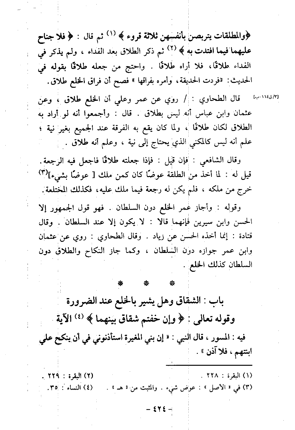 ) والمطلقات يتربصن بأنفسهن ثلاثة قروء) [البقرة: 228] ، ثم قال: (فلا جناح عليهما فيما افتدت به) [البقرة: 229] ، ثم ذكر الطلاق بعد الفداء، ولم يذكر فى الفداء طلاقًا، فلا أراه طلاقًا. واحتج من جعله طلاقًا بقوله فى الحديث: فردت الحديقة، وأمره بفراقها، فصح أن فراق الخلع طلاق. قال الطحاوى: روى عن عمر، وعلى، أن الخلع طلاق، وعن عثمان، وابن عباس، أنه ليس بطلاق. قال: وأجمعوا أنه لو أراد به الطلاق لكان طلاقًا، ولما كان يقع به الفرقة عند الجميع بغير نية، علم أنه ليس كالمكنى الذى يحتاج إلى نية، وعلم أنه طلاق. وقال الشافعى: فإن قيل: فإذا جعلته طلاقًا فاجعل فيه الرجعة. قيل له: لما أخذ من الطلقة عوضًا كان كمن ملك عوضًا بشىء خرج من ملكه، فلم يكن له رجعة فيما ملك عليه، فكذلك المختلعة. وقوله: وأجاز عمر الخلع دون السلطان، فهو قول الجمهور، إلا الحسن، وابن سيرين، فإنهما قالا: لا يكون إلا عند السلطان. وقال قتادة: إنما أخذه الحسن عن زياد. وقال الطحاوى: روى عن عثمان، وابن عمر جوازه دون السلطان، وكما جاز النكاح والطلاق دون السلطان كذلك الخلع.