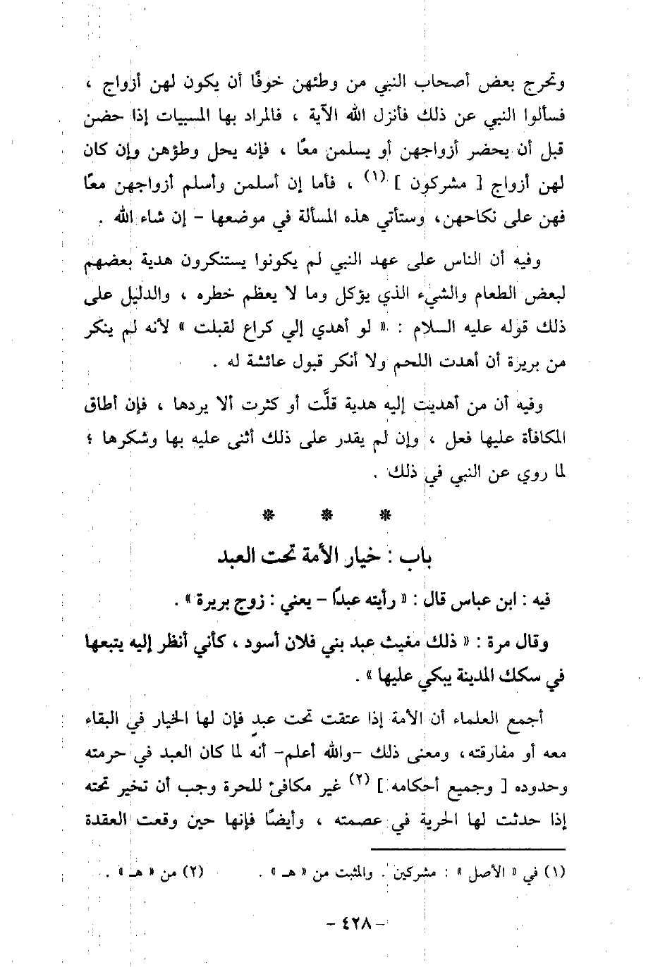 وتحرج بعض أصحاب النبى (صلى الله عليه وسلم) من وطئهن خوفًا أن يكون لهن أزواج، فسألوا النبى (صلى الله عليه وسلم) عن ذلك، فأنزل الله الآية. فالمراد بها المسبيات إذا حضن قبل أن يحضر أزواجهن أو يسلمن معًا، فإنه يحل وطؤهن وإن كان لهن أزواج مشركون، فأما إن أسلمن وأسلم أزواجهن معًا، فهن على نكاحهن، وستأتى هذه المسألة فى موضعها، إن شاء الله. وفيه: أن الناس على عهد النبى (صلى الله عليه وسلم) لم يكونوا يستنكرون هدية بعضهم لبعض الطعام والشىء الذى يؤكل وما لا يعظم خطره، والدليل على ذلك قوله عليه السلام: (لو أهدى إلى كراع لقبلت) ؛ لأنه لم ينكر من بريرة أن أهدت اللحم ولا أنكر قبول عائشة له. وفيه: أن من أهديت إليه هدية قلت أو كثرت ألا يردها، فإن أطاق المكافأة عليها فعل، وإن لم يقدر على ذلك أثنى عليه بها وشكرها؛ لما روى عن النبى (صلى الله عليه وسلم) فى ذلك.
