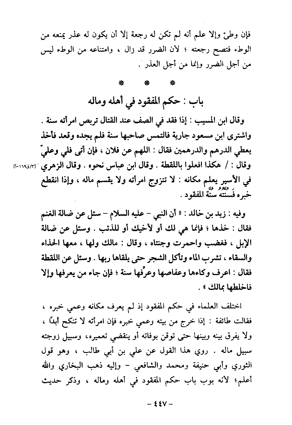 - بَاب حُكْمِ الْمَفْقُودِ فِى أَهْلِهِ وَمَالِهِ