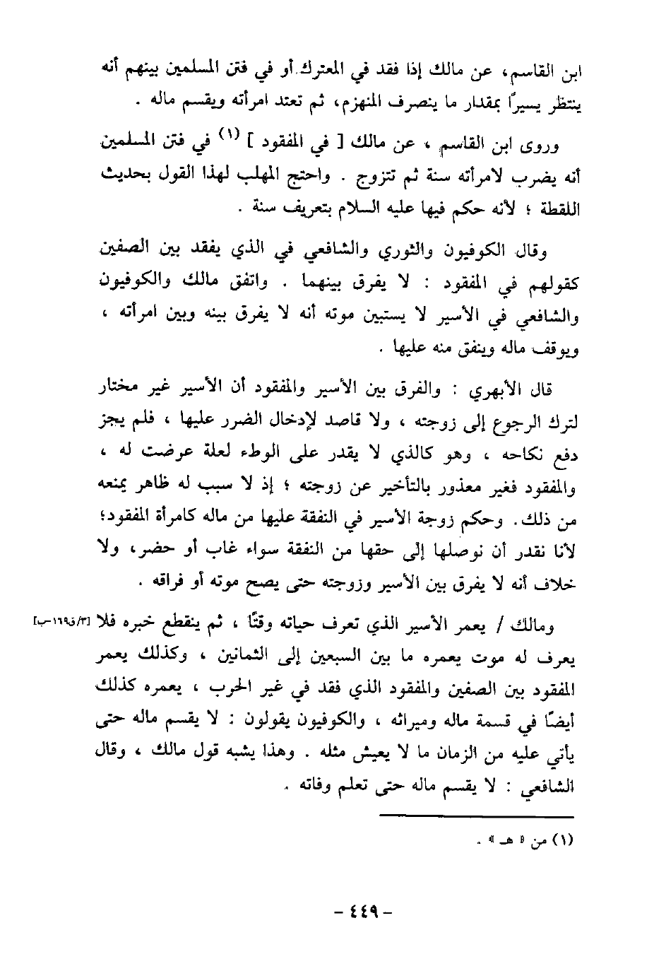 ابن القاسم، عن مالك، إذا فقد فى المعترك أو فتن المسلمين بينهم أنه ينتظر يسيرًا بمقدار ما ينصرف المنهزم، ثم تعتد امرأته ويقسم ماله. وروى ابن القاسم، عن مالك فى المفقود فى فتن المسلمين أنه يضرب لامرأته سنة ثم تتزوج، واحتج المهلب لهذا القول بحديث اللقظة؛ لأنه حكم فيها عليه السلام بتعريف سنة. وقال الكوفيون، والثورى، والشافعى فى الذى يفقد بين الصفين كقولهم فى المفقود: لا يفرق بينهما، واتفق مالك، والكوفيون، والشافعى فى الأسير لا يستبين موته أنه لا يفرق بينه وبين امرأته، ويوقف ماله وينفق منه عليها. قال الأبهرى: والفرق بين الأسير والمفقود أن الأسير غير مختار لترك الرجوع إلى زوجته، ولا قاصد لإدخال الضرر عليها، فلم يجز دفع نكاحه، وهو كالذى لا يقدر على الوطء لعلة عرضت له، والمفقود فغير معذور بالتأخير عن زوجته، إذ لا سبب له ظاهر يمنعه من ذلك، وحكم زوجة الأسير فى النفقة عليها من ماله كامرأة المفقود؛ لأنا نقدر أن نوصلها إلى حقها من النفقة، سواء غاب أو حضر، ولا خلاف أنه لا يفرق بين الأسير وزوجته حتى يصح موته أو فراقه. ومالك يعمر الأسير الذى تعرف حياته وقتًا، ثم ينقطع خبره فلا يعرف له موت، يعمره ما بين السبعين إلى الثمانين، وكذلك يعمر المفقود بين الصفين والمفقود الذى فقد فى غير الحرب، يعمره كذلك أيضًأ فى قسمة ماله وميراثه، والكوفيون يقولون: لا يقسم ماله حتى يأتى عليه من الزمان ما لا يعيش مثله، وهذا يشبه قول مالك، وقال الشافعى: لا يقسم ماله حتى تعلم وفاته.
