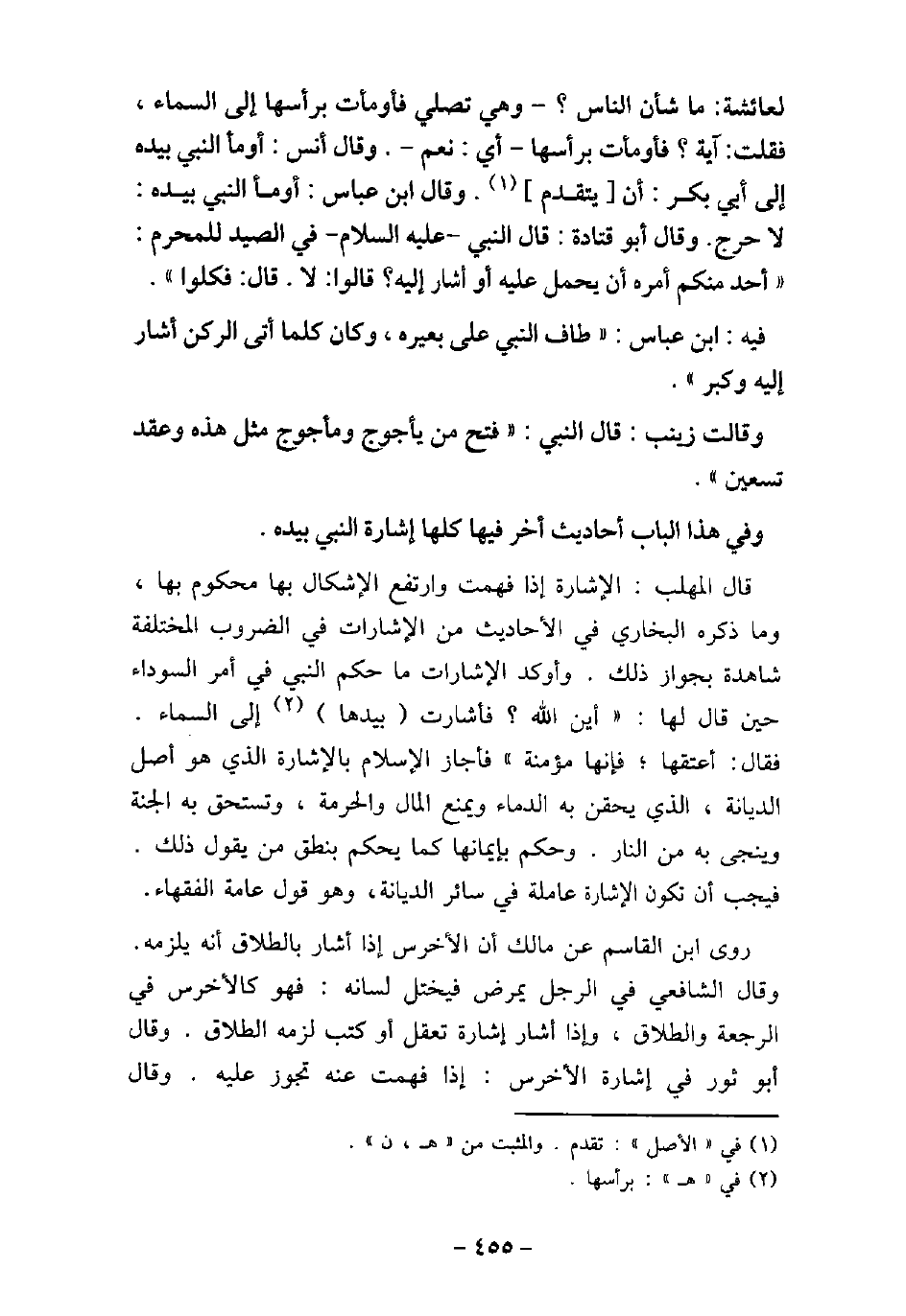 لِعَائِشَةَ: مَا شَأْنُ النَّاسِ؟ وَهِىَ تُصَلِّى، فَأَوْمَأَتْ بِرَأْسِهَا إِلَى الشَّمْسِ، فَقُلْتُ: آيَةٌ، فَأَوْمَأَتْ بِرَأْسِهَا، أَنْ نَعَمْ. وَقَالَ أَنَسٌ: أَوْمَأَ النَّبِىُّ (صلى الله عليه وسلم) بِيَدِهِ إِلَى أَبِى بَكْرٍ أَنْ يَتَقَدَّمَ. وَقَالَ ابْنُ عَبَّاسٍ: أَوْمَأَ النَّبِىُّ (صلى الله عليه وسلم) بِيَدِهِ: (لا حَرَجَ) . وَقَالَ أَبُو قَتَادَةَ: قَالَ النَّبِىُّ، عَلَيْهِ السَّلام، فِى الصَّيْدِ لِلْمُحْرِمِ: (أحَدٌ مِنْكُمْ أَمَرَهُ أَنْ يَحْمِلَ عَلَيْهَا، أَوْ أَشَارَ إِلَيْهِ؟) ، قَالُوا: لا، قَالَ: (فَكُلُوا) . / 29 - فيه: ابْن عَبَّاسٍ، طَافَ النَّبِىّ (صلى الله عليه وسلم) عَلَى بَعِيرِهِ، وَكَانَ كُلَّمَا أَتَى عَلَى الرُّكْنِ أَشَارَ إِلَيْهِ وَكَبَّرَ. وَقَالَتْ زَيْنَبُ: قَالَ النَّبِىُّ (صلى الله عليه وسلم) : (فُتِحَ مِنْ [رَدْمِ] يَأْجُوجَ وَمَأْجُوجَ مِثْلُ هَذِهِ وَعَقَدَ تِسْعِينَ) . وفى هذا الباب أحاديث أخر فيها كلها إشارة النبى (صلى الله عليه وسلم) بيده. قال المهلب: الإشارة إذا فهمت وارتفع الإشكال بها محكوم بها، وما ذكره البخارى فى الأحاديث من الإشارات فى الضروب المختلفة شاهدة بجواز ذلك، وأوكد الإشارات ما حكم النبى (صلى الله عليه وسلم) فى أمر السوداء حين قال لها: (أين الله؟) ، فأشارت بيدها إلى السماء، فقال: (أعتقها فإنها مؤمنة) ، فأجاز الإسلام بالإشارة الذى هو أصل الديانة، الذى يحقن به الدماء ويمنع المال والحرمة، وتستحق به الجنة وينجى به من النار، وحكم بإيمانها كما يحكم بنطق من يقول ذلك، فيجب أن تكون الإشارة عاملة فى سائر الديانة، وهو قول عامة الفقهاء. روى ابن القاسم، عن مالك، أن الأخرس إذا أشار بالطلاق أنه يلزمه، وقال الشافعى فى الرجل يمرض فيختل لسانه: فهو كالأخرس فى الرجعة والطلاق، وإذا أشار إشارة تعقل أو كتب لزمه الطلاق. وقال أبو ثور فى إشارة الأخرس: إذا فهمت عنه تجوز عليه. وقال