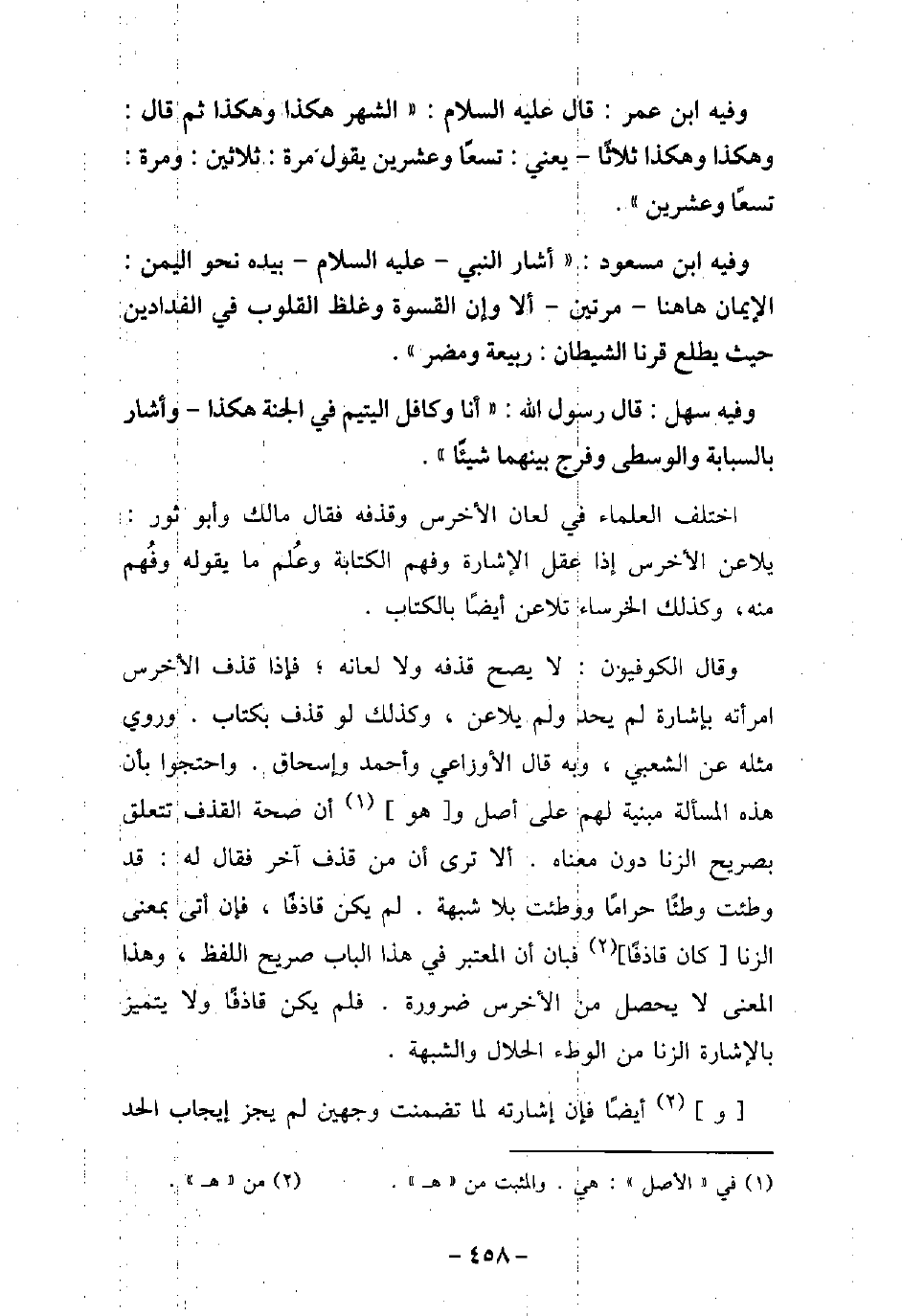 / 32 - وفيه: ابْن عُمَرَ، قَالَ، عَلَيْهِ السَّلام: (الشَّهْرُ هَكَذَا وَهَكَذَا ثَلاَثًا) - يَعْنِى ثَلاثِينَ - ثُمَّ قَالَ: (وَهَكَذَا وَهَكَذَا ثَلاًثًا) - يَعْنِى تِسْعًا وَعِشْرِينَ - يَقُولُ: مَرَّةً ثَلاثِينَ وَمَرَّةً تِسْعًا وَعِشْرِينَ. / 33 - وفيه: ابْن مَسْعُود، قَالَ: أَشَارَ النَّبِىُّ، عَلَيْهِ السَّلام، بِيَدِهِ نَحْوَ الْيَمَنِ: (الإيمَانُ هَا هُنَا مَرَّتَيْنِ، أَلا وَإِنَّ الْقَسْوَةَ وَغِلَظَ الْقُلُوبِ فِى الْفَدَّادِينَ، حَيْثُ يَطْلُعُ قَرْنَا الشَّيْطَانِ رَبِيعَةَ وَمُضَرَ) . / 34 - وفيه: سهل: قَالَ رَسُولُ اللَّهِ (صلى الله عليه وسلم) : (أَنَا وَكَافِلُ الْيَتِيمِ فِى الْجَنَّةِ هَكَذَا، وَأَشَارَ بِالسَّبَّابَةِ وَالْوُسْطَى وَفَرَّجَ بَيْنَهُمَا شَيْئًا) . اختلف العلماء فى لعان الأخرس وقذفه، فقال مالك، وأبو ثور: يلاعن الأخرس إذا عقل الإشارة، وفهم الكتابة، وعلم ما يقوله، وفهم منه، وكذلك الخرساء تلاعن أيضًا بالكتاب. وقال الكوفيون: لا يصح قذفه ولا لعانه، فإذا قذف الأخرس امرأته بإشارة لم يحد ولم يلاعن، وكذلك لو قذف بكتاب، وروى مثله عن الشعبى، وبه قال الأوزاعى، وأحمد، وإسحاق، واحتجوا بأن هذه المسألة مبنية لهم على أصل، وهو أن صحة القذف تتعلق بصريح الزنا دون معناه، ألا ترى أن من قذف آخر، فقال له: قد وطئت وطئًا حرامًا ووطئت بلا شبهة، لم يكن قاذفًا، فإن أتى بمعنى الزنا كان قاذفًا، فبان أن المعتبر فى هذا الباب صريح اللفظ، وهذا المعنى لا يحصل من الأخرس ضرورة، فلم يكن قاذفًا ولا يتميز بالإشارة الزنا من الوطء الحلال والشبهة. وأيضًا فإن إشارته لما تضمنت وجهين لم يجز إيجاب الحد
