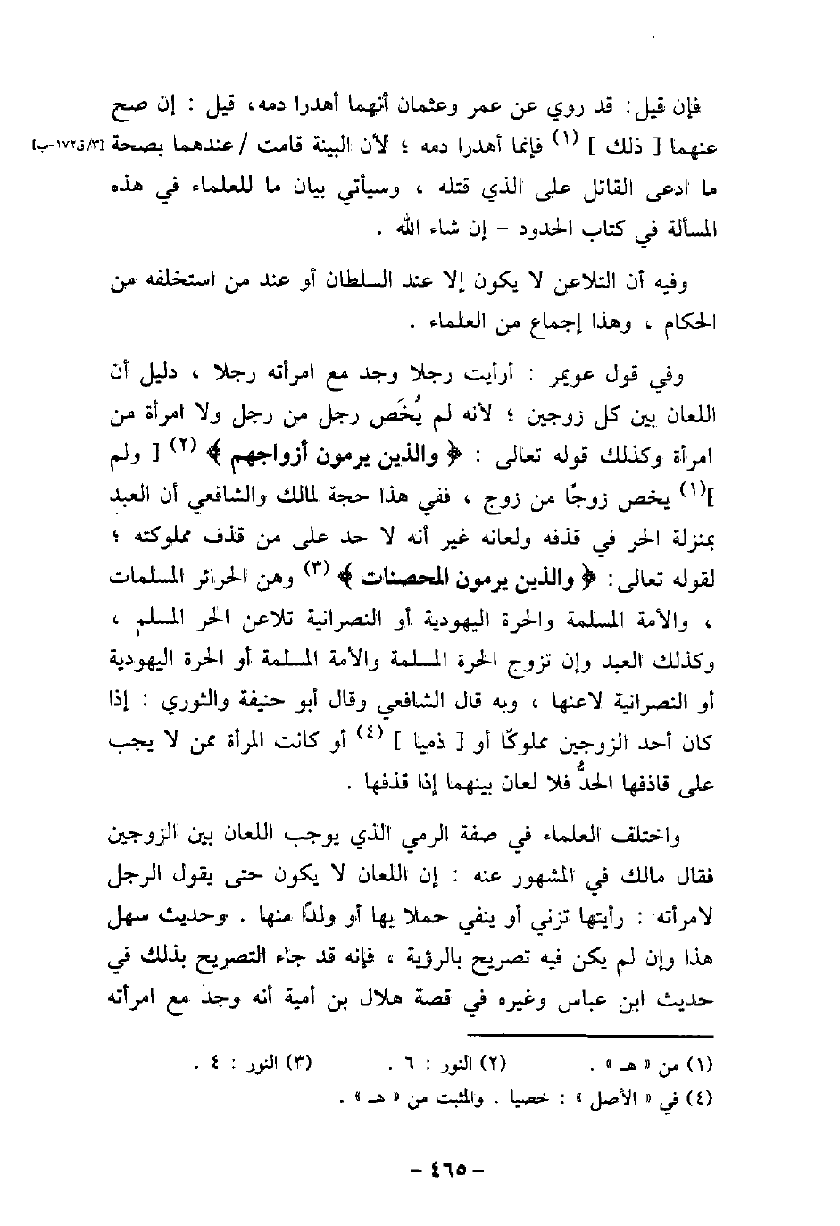 فإن قيل: قد روى عن عمر وعثمان أنهما أهدرا دمه، قيل: إن صح عنهما ذلك فإنما أهدرا دمه؛ لأن البينة قامت عندهما بصحة ما ادعى القاتل على الذى قتله، وسيأتى بيان ما للعلماء فى هذه المسألة فى كتاب الحدود، إن شاء الله. وفيه: أن التلاعن لا يكون إلا عند السلطان، أو عند من استخلفه من الحكام، وهذا إجماع من العلماء. وفى قول عويمر: أرأيت رجلاً وجد مع امرأته رجلاً، دليل أن اللعان بين كل زوجين؛ لأنه لم يُخَص رجل من رجل، ولا امرأة من امرأة، وكذلك قوله تعالى: (والذين يرمون أزواجهم) [النور: 6] ، ولم يخص زوجًا من زوج، ففى هذا حجة لمالك والشافعى أن العبد بمنزلة الحر فى قذفه ولعانه، غير أنه لا حد على من قذف مملوكته؛ لقوله تعالى: (والذين يرمون المحصنات) [النور: 4] ، وهن الحرائر المسلمات، والأمة المسلمة والحرة اليهودية أو النصرانية تلاعن الحر المسلم، وكذلك العبد وإن تزوج الحرة المسلمة والأمة المسلمة أو الحرة اليهودية أو النصرانية لاعنها، وبه قال الشافعى، وقال أبو حنيفة والثورى: إذا كان أحد الزوجين مملوكًا أو ذميًا أو كانت المرأة ممن لا يجب على قاذفها الحد، فلا لعان بينهما إذا قذفها. واختلف العلماء فى صفة الرمى الذى يوجب اللعان بين الزوجين، فقال مالك فى المشهور عنه: إن اللعان لا يكون حتى يقول الرجل لامرأته: رأيتها تزنى أو ينفى حملاً بها أو ولدًا منها، وحديث سهل هذا وإن لم يكن فيه تصريح بالرؤية، فإنه قد جاء التصريح بذلك فى حديث ابن عباس وغيره فى قصة هلال بن أمية أنه وجد مع امرأته