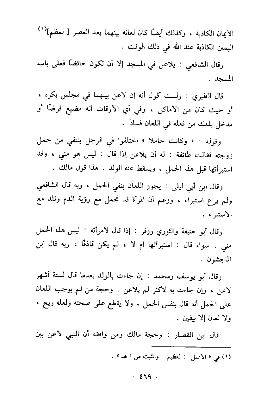 الأيمان الكاذبة، وكذلك أيضًا كان لعانه بينهما بعد العصر لعظم اليمين الكاذبة عند الله فى ذلك الوقت. وقال الشافعى: يلاعن فى المسجد إلا أن تكون حائضًا، فعلى باب المسجد. قال الطبرى: ولست أقول أنه إن لاعن بينهما فى مجلس يكره، أو حيث كان من الأماكن، وفى أى الأوقات أنه مضيع فرضًا أو مدخل بذلك من فعله فى اللعان فسادًا. وقوله: وكانت حاملاً، اختلفوا فى الرجل ينتفى من حمل زوجته، فقالت طائفة: له أن يلاعن إذا قال: ليس هو منى، وقد استبرأتها قبل هذا الحمل، ويسقط عنه الولد، هذا قول مالك. وقال ابن أبى ليلى: يجوز اللعان بنفى الحمل، وبه قال الشافعى، ولم يراع استبراء، وزعم أن المرأة قد تحمل مع رؤية الدم وتلد مع الاستبراء. وقال أبو حنيفة والثورى وزفر: إذا قال لامرأته: ليس هذا الحمل منى، سواء قال: استبرأتها أم لا، لم يكن قاذفًا، وبه قال ابن الماجشون. وقال أبو يوسف ومحمد: إن جاءت بالولد بعدما قال لستة أشهر لاعن، وإن جاءت به لأكثر لم يلاعن، وحجة من لم يوجب اللعان على الحمل أنه قال بنفس الحمل، ولا يقطع على صحته ولعله ريح، ولا لعان إلا بيقين. قال ابن القصار: وحجة مالك ومن وافقه أن النبى (صلى الله عليه وسلم) لاعن بين