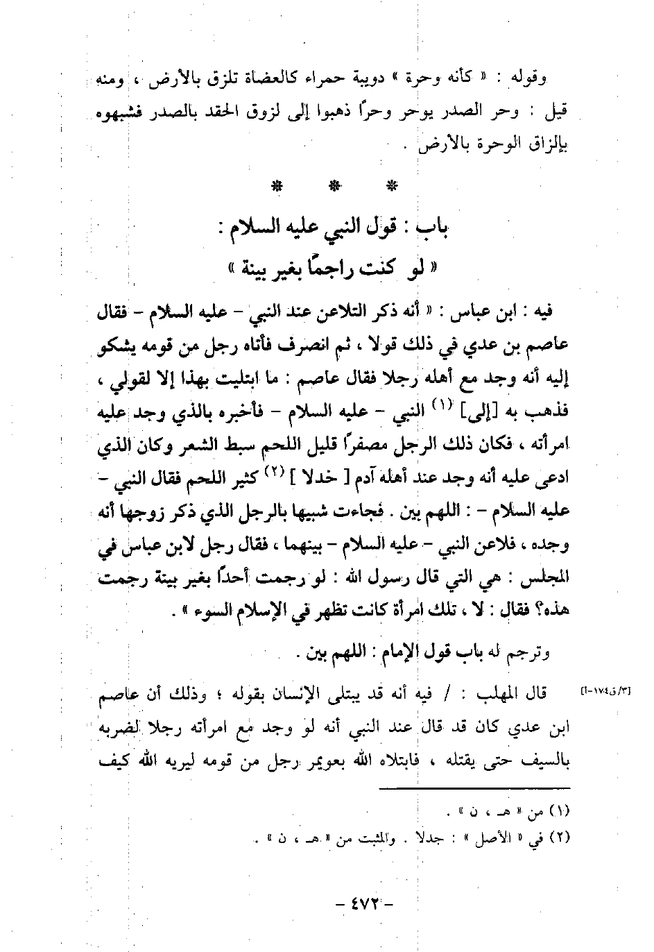 / 40 - فيه: ابْن عَبَّاس: أَنَّهُ ذُكِرَ التَّلاعُنُ عِنْدَ النَّبِىِّ، عَلَيْهِ السَّلام، فَقَالَ عَاصِمُ بْنُ عَدِىٍّ فِى ذَلِكَ قَوْلا، ثُمَّ انْصَرَفَ، فَأَتَاهُ رَجُلٌ مِنْ قَوْمِهِ يَشْكُو إِلَيْهِ أَنَّهُ قَدْ وَجَدَ مَعَ أَهْلِهِ رَجُلا، فَقَالَ عَاصِمٌ: مَا ابْتُلِيتُ بِهَذَا الأمْرِ إِلا لِقَوْلِى، فَذَهَبَ بِهِ إِلَى النَّبِىِّ، عَلَيْهِ السَّلام، فَأَخْبَرَهُ بِالَّذِى وَجَدَ عَلَيْهِ امْرَأَتَهُ، وَكَانَ ذَلِكَ الرَّجُلُ مُصْفَرًّا، قَلِيلَ اللَّحْمِ سَبْطَ الشَّعَرِ، وَكَانَ الَّذِى ادَّعَى عَلَيْهِ أَنَّهُ وَجَدَهُ عِنْدَ أَهْلِهِ، خَدْلا آدَمَ كَثِيرَ اللَّحْمِ، فَقَالَ النَّبِىُّ، عَلَيْهِ السَّلام: (اللَّهُمَّ بَيِّنْ) ، فَجَاءَتْ شَبِيهًا بِالرَّجُلِ الَّذِى ذَكَرَ زَوْجُهَا أَنَّهُ وَجَدَهُ، فَلاعَنَ النَّبِىُّ، عَلَيْهِ السَّلام، بَيْنَهُمَا، فَقَالَ رَجُلٌ لابْنِ عَبَّاسٍ فِى الْمَجْلِسِ: هِىَ الَّتِى قَالَ رسول الله (صلى الله عليه وسلم) : (لَوْ رَجَمْتُ أَحَدًا بِغَيْرِ بَيِّنَةٍ رَجَمْتُ هَذِهِ) ، فَقَالَ: لا، تِلْكَ امْرَأَةٌ كَانَتْ تُظْهِرُ فِى الإسْلامِ السُّوءَ. وترجم له: (باب قول الإمام: اللهم بين) . قال المهلب: فيه أنه قد يبتلى الإنسان بقوله، وذلك أن عاصم بن عدى كان قد قال عند النبى (صلى الله عليه وسلم) أنه لو وجد مع امرأته رجلاً لضربه بالسيف حتى يقتله، فابتلاه الله بعويمر رجل من قومه ليريه الله كيف
