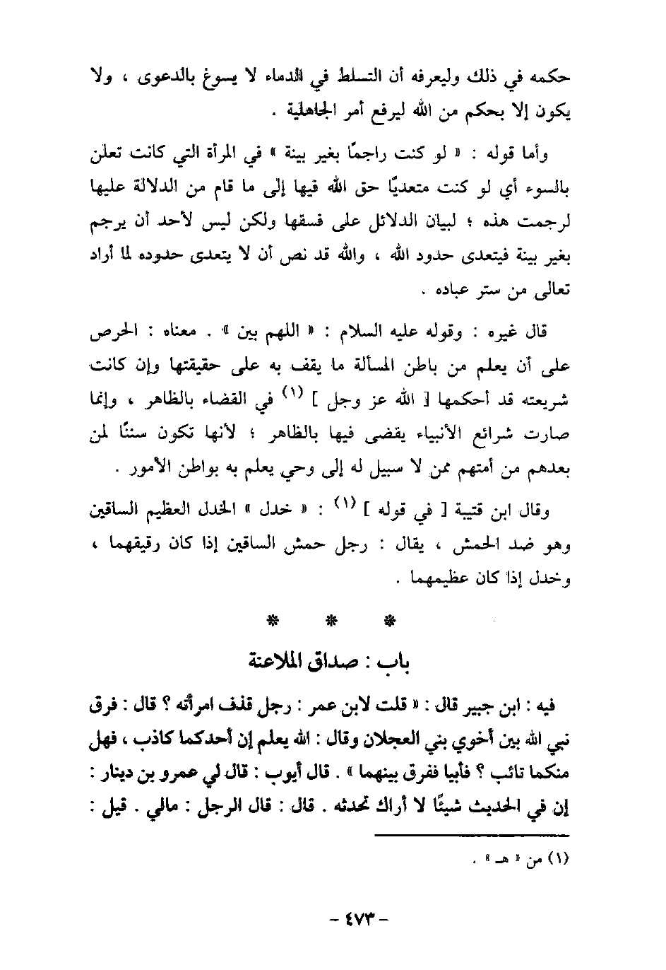 حكمه فى ذلك، وليعرفه أن التسلط فى الدماء لا يسوغ بالدعوى، ولا يكون إلا بحكم من الله ليرفع أمر الجاهلية. وأما قوله: (لو كنت راجمًا بغير بينة) ، فى المرأة التى كانت تعلن بالسوء، أى لو كنت متعديًا حق الله فيها إلى ما قام من الدلالة عليها لرجمت هذه، لبيان الدلائل على فسقها، ولكن ليس لأحد أن يرجم بغير بينة فيتعدى حدود الله، والله قد نص أن لا يتعدى حدوده لما أراد تعالى من ستر عباده. قال غيره: وقوله عليه السلام: (اللهم بين) ، معناه الحرص على أن يعلم من باطن المسألة ما يقف به على حقيقتها، وإن كانت شريعته قد أحكمها الله عز وجل فى القضاء بالظاهر، وإنما صارت شرائع الأنبياء يقضى فيها بالظاهر؛ لأنها تكون سننًا لمن بعدهم من أمتهم ممن لا سبيل له إلى وحى يعلم به بواطن الأمور. وقال ابن قتيبة فى قوله: (خدل) ، الخدل العظيم الساقين، وهو ضد الحمش، يقال: رجل حمش الساقين إذا كان رقيقهما، وخدل إذا كان عظيمهما.