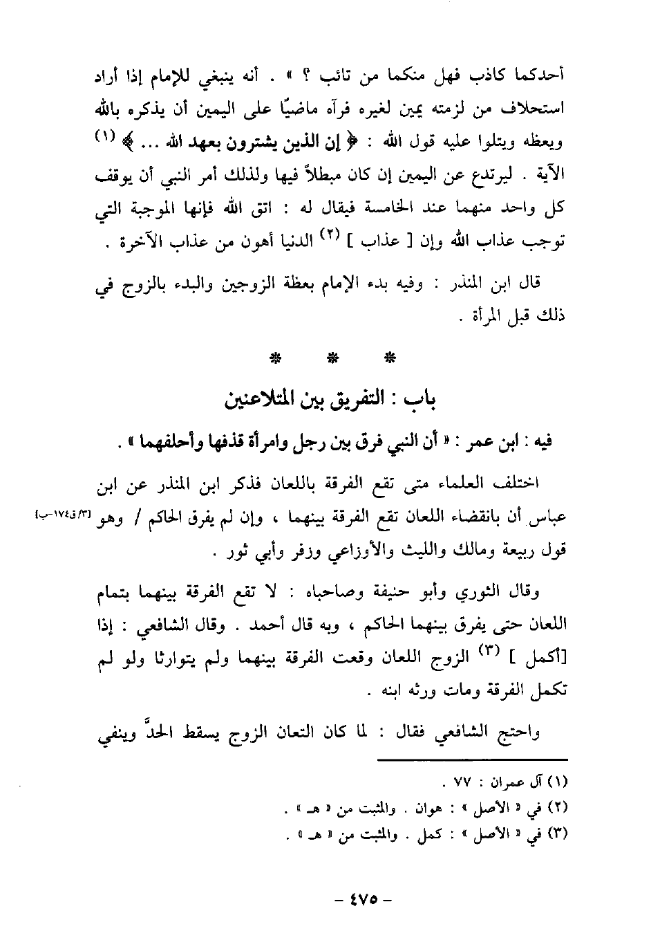 / 42 - فيه: ابْن عُمَرَ، أَنَّ النَّبِىّ (صلى الله عليه وسلم) فَرَّقَ بَيْنَ رَجُلٍ وَامْرَأَةٍ قَذَفَهَا وَأَحْلَفَهُمَا. اختلف العلماء متى تقع الفرقة باللعان، فذكر ابن المنذر، عن ابن عباس، أن بانقضاء اللعان تقع الفرقة بينهما، وإن لم يفرق الحاكم، وهو قول ربيعة، ومالك، والليث، والأوزاعى، وزفر، وأبى ثور. وقال الثورى، وأبى حنيفة وصاحباه: لا تقع الفرقة بينهما بتمام اللعان حتى يفرق بينهما الحاكم، وبه قال أحمد. وقال الشافعى: إذا أكمل الزوج اللعان وقعت الفرقة بينهما ولم يتوارثا ولو لم تكمل الفرقة ومات ورثه ابنه. واحتج الشافعى، فقال: لما كان التعان الزوج يسقط الحد وينفى