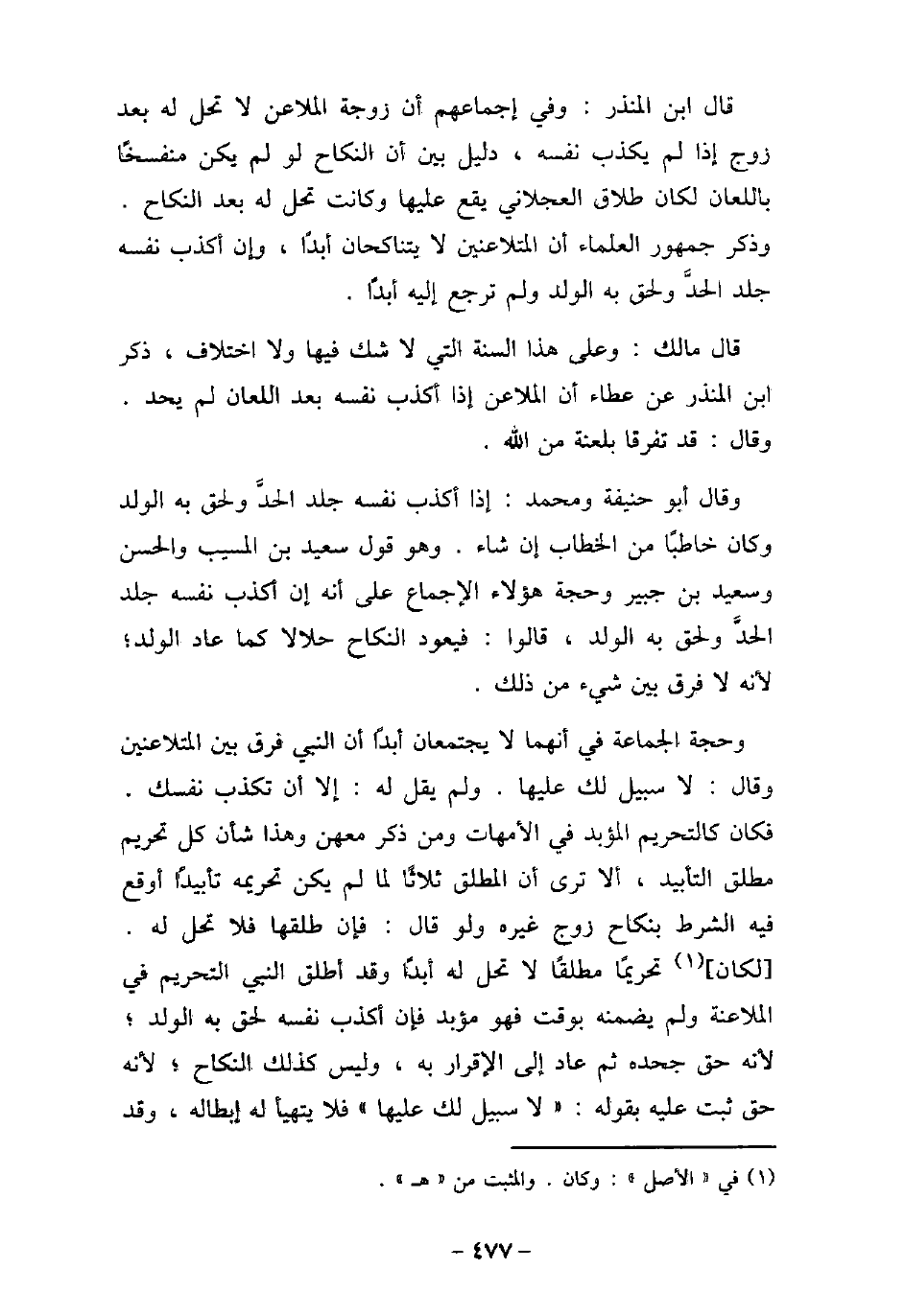 قال ابن المنذر: وفى إجماعهم أن زوجة الملاعن لا تحل له بعد زوج إذا لم يكذب نفسه، دليل بين أن النكاح لو لم يكن منفسخًا باللعان، لكان طلاق العجلانى يقع عليها، وكانت تحل له بعد النكاح. وذكر جمهور العلماء أن المتلاعنين لا يتناكحان أبدًا، وإن أكذب نفسه جلد الحد ولحق به الولد ولم ترجع إليه أبدًا. قال مالك: وعلى هذا السنة التى لا شك فيها ولا اختلاف، ذكر ابن المنذر، عن عطاء، أن الملاعن إذا أكذب نفسه بعد اللعان لم يحد. وقال: قد تفرقا بلعنة من الله. وقال أبو حنيفة ومحمد: إذا أكذب نفسه جلد الحد ولحق به الولد، وكان خاطبًا من الخطاب إن شاء، وهو قول سعيد بن المسيب، والحسن، وسعيد بن جبير، وحجة هؤلاء الإجماع على أنه إن أكذب نفسه جلد الحد ولحق به الولد، قالوا: فيعود النكاح حلالاً كما عاد الولد؛ لأنه لا فرق بين شىء من ذلك. وحجة الجماعة فى أنهما لا يجتمعان أبدًا أن النبى (صلى الله عليه وسلم) فرق بين المتلاعنين، وقال: لا سبيل لك عليها، ولم يقل له: إلا أن تكذب نفسك، فكان كالتحريم المؤبد فى الأمهات ومن ذكر معهن، وهذا شأن كل تحريم مطلق التأبيد، ألا ترى أن المطلق ثلاثًا لما لم يكن تحريمه تأبيدًا أوقع فيه الشرط بنكاح زوج غيره، ولو قال: فإن طلقها فلا تحل له، لكان تحريمًا مطلقًا لا تحل له أبدًا، وقد أطلق النبى (صلى الله عليه وسلم) التحريم فى الملاعنة، ولم يضمنه بوقت، فهو مؤبد، فإن أكذب نفسه لحق به الولد؛ لأنه حق جحده ثم عاد إلى الإقرار به، وليس كذلك النكاح؛ لأنه حق ثبت عليه بقوله: (لا سبيل لك عليها) ، فلا يتهيأ له إبطاله، وقد
