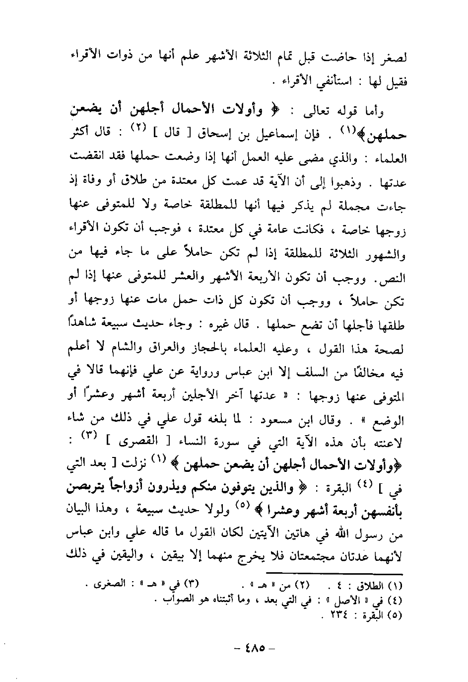 لصغر إذا حاضت قبل تمام الثلاثة الأشهر علم أنها من ذوات القراء، فقيل لها: استأنفى الأقراء. وأما قوله تعالى: (وأولات الأحمال أجلهن أن يضعن حملهن) [الطلاق: 4] ، فإن إسماعيل بن إسحاق قال: قال أكثر العلماء: والذى مضى عليه العمل أنها إذا وضعت حملها فقد انقضت عدتها، وذهبوا إلى أن الآية قد عمت كل معتدة من طلاق أو وفاة إذ جاءت مجملة لم يذكر فيها أنها للمطلقة خاصة ولا للمتوفى عنها زوجها خاصة، فكانت عامة فى كل معتدة، فوجب أن تكون الأقراء والشهور الثلاثة للمطلقة إذا لم تكن حاملاً على ما جاء فيها من النص، ووجب أن تكون الأربعة الأشهر والعشر للمتوفى عنها إذا لم تكن حاملاً، ووجب أن تكون كل ذات حمل مات عنها زوجها أو طلقها، فأجلها أن تضع حملها. قال غيره: وجاء حديث سبيعة شاهدًا لصحة هذا القول، وعليه العلماء بالحجاز، والعراق، والشام، لا أعلم فيه مخالفًا من السلف إلا ابن عباس، ورواية عن على فإنهما قالا فى المتوفى عنها زوجها: عدتها آخر الأجلين أربعة أشهر وعشرًا أو الوضع. وقال ابن مسعود: لما بلغه قول على فى ذلك من شاء لاعنته بأن هذه الآية التى فى سورة النساء القصرى: (وأولات الأحمال أجلهن أن يضعن حملهن) [الطلاق: 4] ، نزلت بعد التى فى البقرة: (والذين يتوفون منكم ويذرون أزواجًا يتربصن بأنفسهن أربعة أشهر وعشرًا) [البقرة: 234] ، ولولا حديث سبيعة، وهذا البيان من رسول الله (صلى الله عليه وسلم) فى هاتين الآيتين لكان القول ما قاله على، وابن عباس؛ لأنهما عدتان مجتمعتان، فلا يخرج منهما إلا بيقين، واليقين فى ذلك