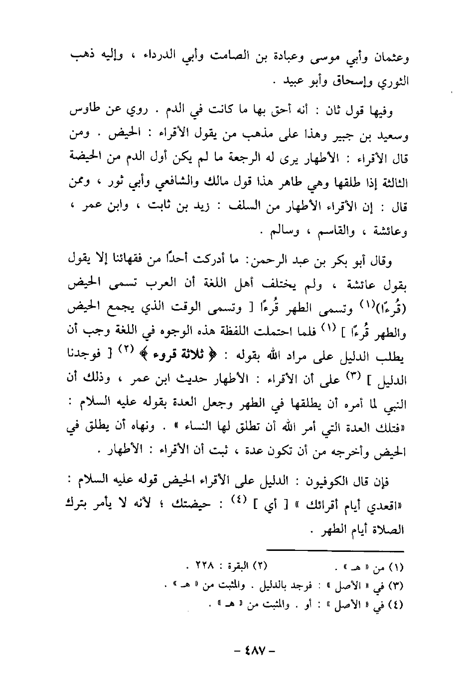 وعثمان، وأبى موسى، وعبادة بن الصامت، وأبى الدرداء، وإليه ذهب الثورى، وإسحاق، وأبو عبيد. وفيها قول ثان: أنه أحق بها ما كانت فى الدم، روى ذلك عن طاوس، وسعيد بن جبير، وهذا على مذهب من يقول: الأقراء الحيض، ومن قال: الأقراء الأطهار، يرى له الرجعة ما لم يكن أول الدم من الحيضة الثالثة إذا طلقها وهى طاهر، هذا قول مالك، والشافعى، وأبى ثور، وممن قال: إن الأقراء الأطهار من السلف، زيد بن ثابت، وابن عمر، وعائشة، والقاسم، وسالم. وقال أبو بكر بن عبد الرحمن: ما أدركت أحدًا من فقهائنا إلا يقول بقول عائشة، ولم يختلف أهل اللغة أن العرب تسمى الحيض قرءًا، وتسمى الطهر قرءًا، وتسمى الوقت الذى يجمع الحيض والطهر قرءًا، فلما احتملت اللفظة هذه الوجوه فى اللغة وجب أن يطلب الدليل على مراد الله بقوله: (ثلاثة قروء) [البقرة: 228] ، فوجدنا الدليل على أن الأقراء الأطهار حديث ابن عمر، وذلك أن النبى (صلى الله عليه وسلم) لما أمره أن يطلقها فى الطهر، وجعل العدة بقوله، عليه السلام: (فتلك العدة التى أمر الله أن تطلق لها النساء) ، ونهاه أن يطلق فى الحيض، وأخرجه من أن تكون عدة، ثبت أن الأقراء الأطهار. فإن قال الكوفيون: الدليل على الأقراء الحيض قوله، عليه السلام: (اقعدى أيام أقرائك) ، أى حيضتك؛ لأنه لا يأمر بترك الصلاة أيام الطهر.