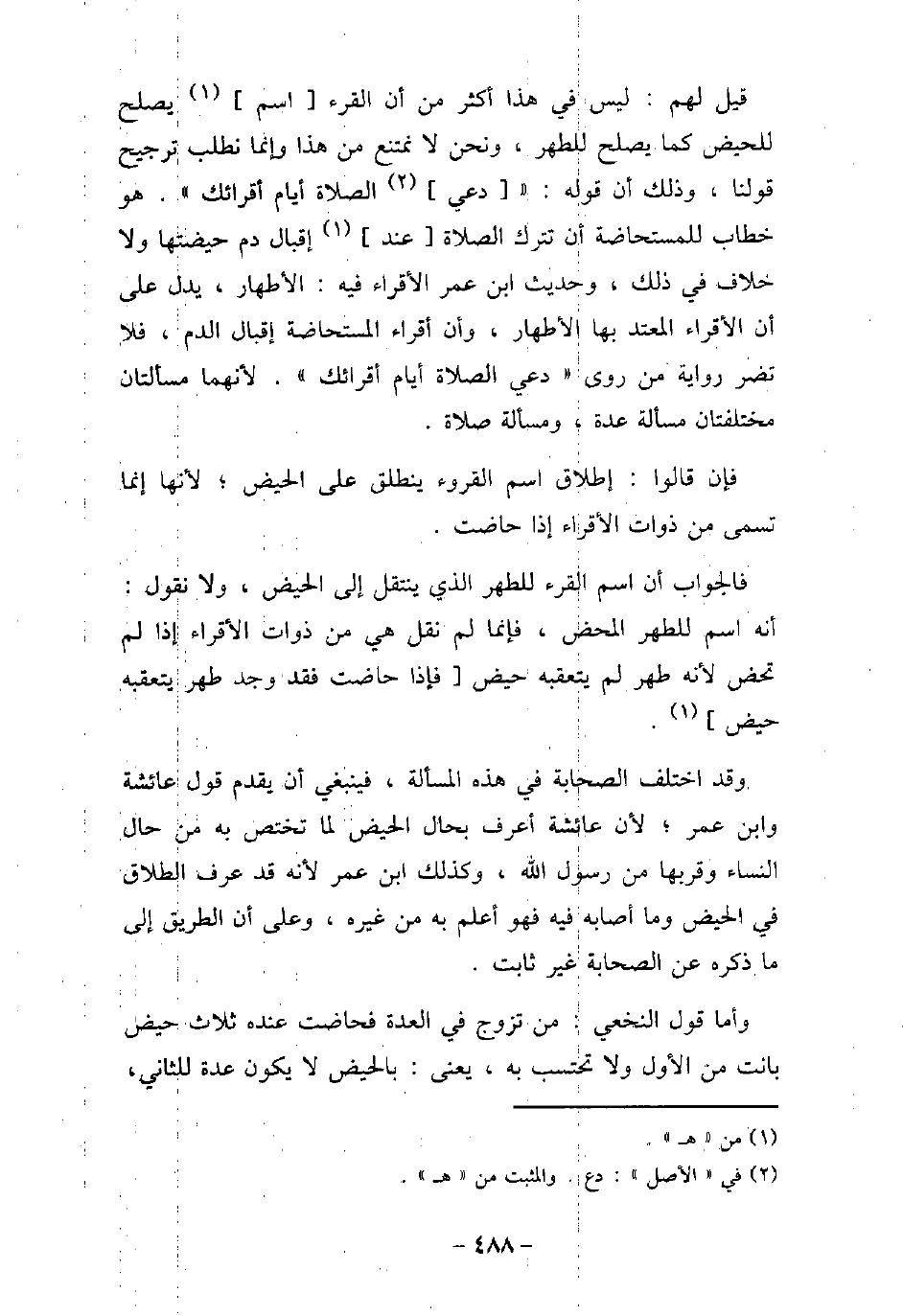 قيل لهم: ليس فى هذا أكثر من أن القرء اسم يصلح للحيض كما يصلح للطهر، ونحن لا نمتنع من هذا، وإنما نطلب ترجيح قولنا، وذلك أن قوله: (دعى الصلاة أيام أقرائك) ، هو خطاب للمستحاضة أن تترك الصلاة عند إقبال دم حيضتها، ولا خلاف فى ذلك، وحديث ابن عمر الأقراء فيه الأطهار، يدل على أن الأقراء المعتد بها الأطهار، وأن أقراء المستحاضة إقبال الدم، فلا تضر رواية من روى: (دعى الصلاة أيام أقرائك) ؛ لأنهما مسألتان مختلفتان، مسألة عدة، ومسألة صلاة. فإن قالوا: إطلاق اسم القروء ينطلق على الحيض؛ لأنها إنما تسمى من ذوات الأقراء إذا حاضت. فالجواب: أن اسم القرء للطهر الذى ينتقل إلى الحيض، ولا نقول: أنه اسم للطهر المحض، فإنما لم نقل هى من ذوات الأقراء إذا لم تحض؛ لأنه طهر لم يتعقبه حيض، فإذا حاضت فقد وجد طهر يتعقبه حيض. وقد اختلف الصحابة فى هذه المسألة، فينبغى أن يقدم قول عائشة وابن عمر؛ لأن عائشة أعرف بحال الحيض؛ لما تختص به من حال النساء وقربها من رسول الله (صلى الله عليه وسلم) ، وكذلك ابن عمر؛ لأنه قد عرف الطلاق فى الحيض وما أصابه فيه، فهو أعلم به من غيره، وعلى أن الطريق إلى ما ذكره عن الصحابة غير ثابت. وأما قول النخعى: من تزوج فى العدة فحضات عنده ثلاث حيض بانت من الأول ولا تحتسب به، يعنى بالحيض لا يكون عدة للثانى؛