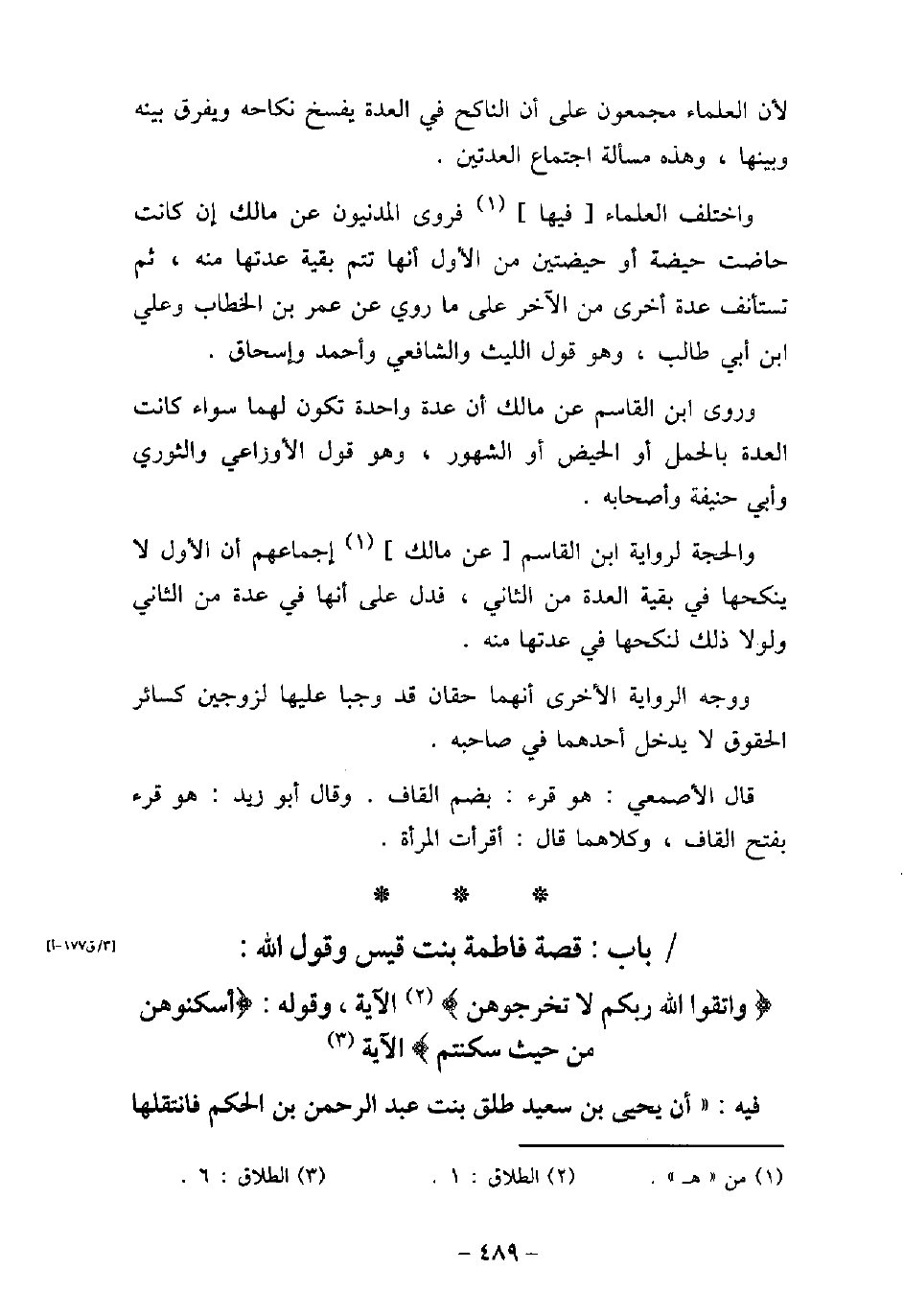 لأن العلماء مجمعون على أن الناكح فى العدة يفسخ نكاحه ويفرق بينه وبينها، وهذه مسألة اجتماع العدتين. واختلف العلماء فيها، فروى المدنيون عن مالك: إن كانت حاضت حيضة أو حيضتين من الأول أنها تتم بقية عدتها منه، ثم تستأنف عدة أخرى من الآخر على ما روى عن عمر ابن الخطاب، وعلى بن أبى طالب، وهو قول الليث، والشافعى، وأحمد، وإسحاق. وروى ابن القاسم، عن مالك، أن عدة واحدة تكون لهما، سواء كانت العدة بالحمل أو الحيض أو الشهور، وهو قول الأوزاعى، والثورى، وأبى حنيفة وأصحابه. والحجة لرواية ابن القاسم، عن مالك، إجماعهم أن الأول لا ينكحها فى بقية العدة من الثانى، فدل على أنها فى عدة من الثانى، ولولا ذلك لنكحها فى عدتها منه. ووجه الرواية الأخرى أنهما حقان قد وجبا عليها لزوجين كسائر الحقوق لا يدخل أحدهما فى صاحبه. قال الأصمعى: هو قرء، بضم القاف. وقال أبو زيد: هو قرء، بفتح القاف، وكلاهما قال: أقرأت المرأة.