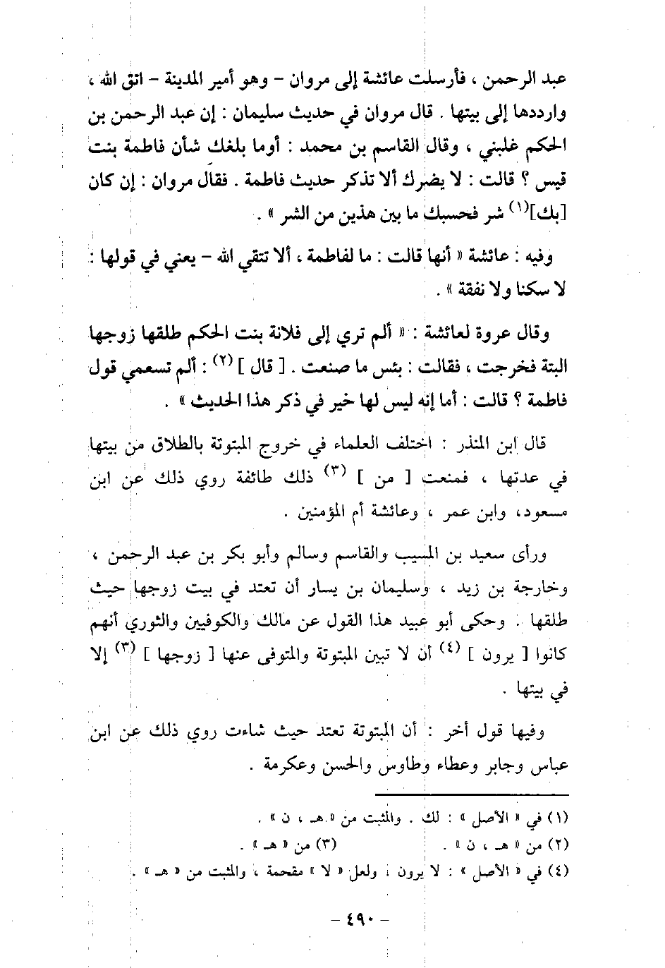 عَبْدُالرَّحْمَنِ، فَأَرْسَلَتْ عَائِشَةُ إِلَى مَرْوَانَ - وَهُوَ أَمِيرُ الْمَدِينَةِ - اتَّقِ اللَّهَ وَارْدُدْهَا إِلَى بَيْتِهَا. قَالَ مَرْوَانُ فِى حَدِيثِ سُلَيْمَانَ: إِنَّ عَبْدَالرَّحْمَنِ بْنَ الْحَكَمِ غَلَبَنِى، وَقَالَ الْقَاسِمُ بْنُ مُحَمَّدٍ: أَوَمَا بَلَغَكِ شَأْنُ فَاطِمَةَ بِنْتِ قَيْسٍ؟ قَالَتْ: لا يَضُرُّكَ أَنْ لا تَذْكُرَ حَدِيثَ فَاطِمَةَ. فَقَالَ مَرْوَانُ: إِنْ كَانَ بِكِ شَرٌّ، فَحَسْبُكِ مَا بَيْنَ هَذَيْنِ مِنَ الشَّرِّ. / 3 - وفيه: عَائِشَةَ، أَنَّهَا قَالَتْ: مَا لِفَاطِمَةَ؟ أَلا تَتَّقِى اللَّهَ - يَعْنِى فِى قَوْلِهَا: لا سُكْنَى وَلا نَفَقَةَ. / 4 - وقَالَ عُرْوَةُ لِعَائِشَةَ: أَلَمْ تَرَىْ إِلَى فُلانَةَ بِنْتِ الْحَكَمِ طَلَّقَهَا زَوْجُهَا الْبَتَّةَ فَخَرَجَتْ، فَقَالَتْ: بِئْسَ مَا صَنَعَتْ، قَالَ: أَلَمْ تَسْمَعِى فِى قَوْلِ فَاطِمَةَ؟ قَالَتْ: أَمَا إِنَّهُ لَيْسَ لَهَا خَيْرٌ فِى ذِكْرِ هَذَا الْحَدِيثِ. قال ابن المنذر: اختلف العلماء فى خروج المبتوتة بالطلاق من بيتها فى عدتها، فمنعت من ذلك طائفة، روى ذلك عن ابن مسعود، وابن عمر، وعائشة أم المؤمنين. ورأى سعيد بن المسيب، والقاسم، وسالم، وأبو بكر بن عبد الرحمن، وخارجة بن زيد، وسليمان بن يسار، أن تعتد فى بيت زوجها حيث طلقها، وحكى أبو عبيد هذا القول عن مالك، والكوفيين، والثورى أنهم كانوا يرون أن لا تبين المبتوتة والمتوفى عنها زوجها إلا فى بيتها. وفيها قول آخر: أن المبتوتة تعتد حيث شاءت، روى ذلك عن ابن عباس، وجابر، وعطاء، وطاوس، والحسن، وعكرمة.