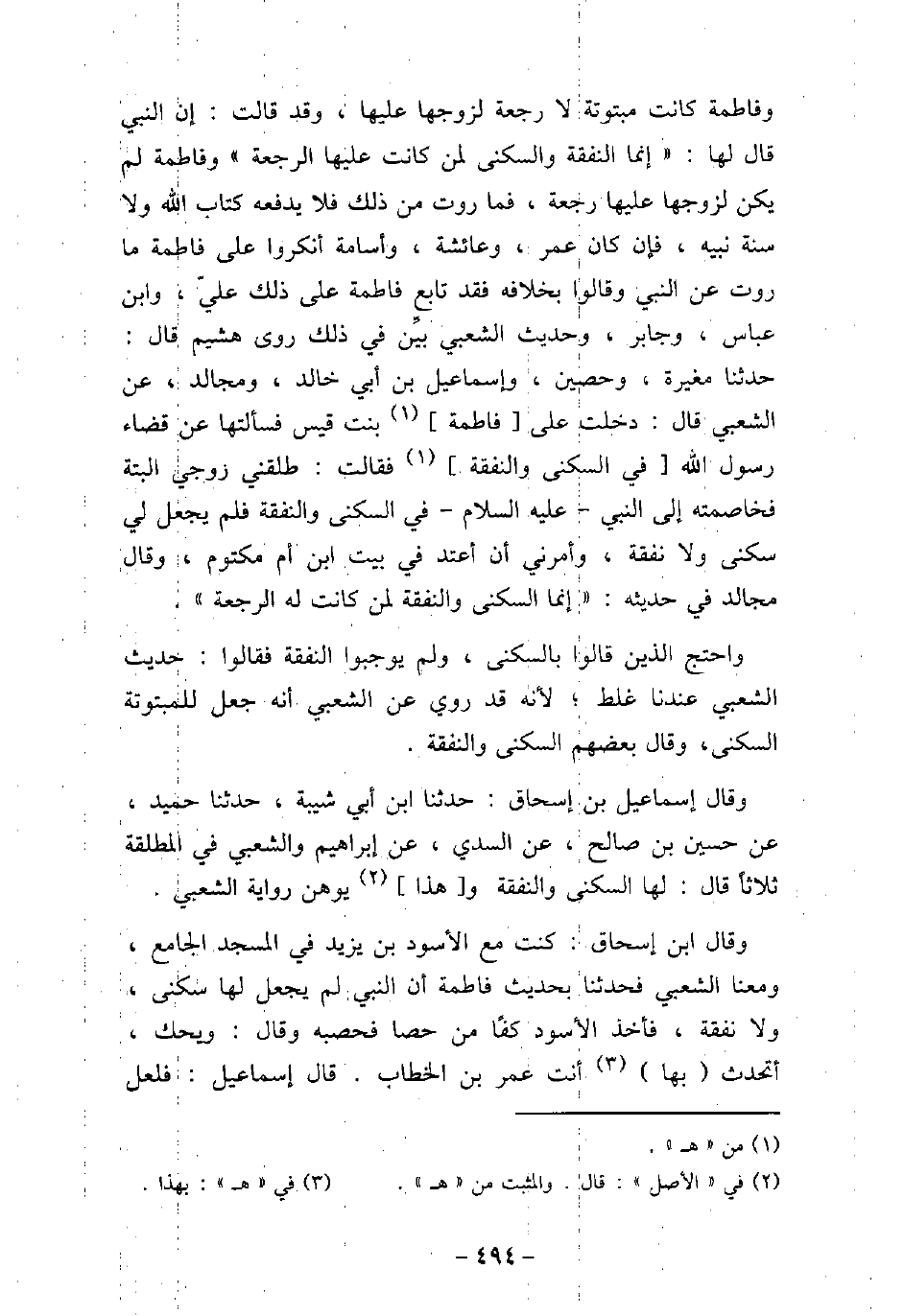 وفاطمة كانت مبتوتة لا رجعة لزوجها عليها، وقد قالت: إن النبى (صلى الله عليه وسلم) قال لها: (إنما النفقة والسكنى لمن كانت عليها الرجعة) ، وفاطمة لم يكن لزوجها عليها رجعة، فما روت من ذلك فلا يدفعه كتاب الله ولا سنة نبيه، فإن كان عمر، وعائشة، وأسامة أنكروا على فاطمة ما روت عن النبى (صلى الله عليه وسلم) وقالوا بخلافه، فقد تابع فاطمة على ذلك على، وابن عباس، وجابر، وحديث الشعبى بين فى ذلك. روى هشيم، قال: حدثنا مغيرة، وحصين، وإسماعيل بن أبى خالد، ومجالد، عن الشعبى، قال: دخلت على فاطمة بنت قيس، فسألتها عن قضاء رسول الله (صلى الله عليه وسلم) فى السكنى والنفقة، فقالت: طلقنى زوجى البتة، فخاصمته إلى النبى، عليه السلام، فى السكنى والنفقة، فلم يجعل لى سكنى ولا نفقة، وأمرنى أن أعتد فى بيت ابن أم مكتوم، وقال مجالد فى حديثه: (إنما السكنى والنفقة لمن كانت له الرجعة) . واحتج الذين قالوا بالسكنى، ولم يوجبوا النفقة، فقالوا: حديث الشعبى عندنا غلط؛ لأنه قد روى عن الشعبى أنه جعل للمبتوتة السكنى، وقال بعضهم: السكنى والنفقة. وقال إسماعيل بن إسحاق: حدثنا ابن أبى شيبة، حدثنا حميد، عن حسين بن صالح، عن السدى، عن إبراهيم والشعبى فى المطلقة ثلاثًا، قالا: لها السكنى والنفقة، وهذا يوهن رواية الشعبى. وقال ابن إسحاق: كنت مع الأسود بن يزيد فى المسجد الجامع ومعنا الشعبى، فحدثنا بحديث فاطمة أن النبى (صلى الله عليه وسلم) لم يجعل لها سكنى ولا نفقة، فأخذ الأسود كفًا من حصا فحصبه، وقال: ويحك، أتحدث بها أنت عمر بن الخطاب. قال إسماعيل: فلعل