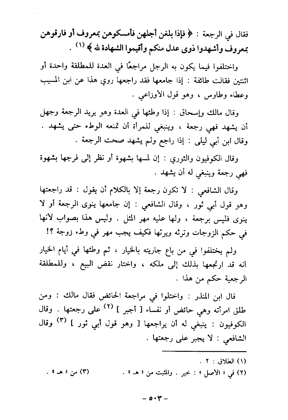 فقال فى الرجعة: (فإذا بلغن أجلهن فأمسكوهن بمعروف أو فارقوهن بمعروف وأشهدوا ذوى عدل منكم وأقيموا الشهادة لله) [الطلاق: 2] . واخلتفوا فيما يكون به الرجل مراجعًا فى العدة للمطلقة واحدة أو اثنتين، فقالت طائفة: إذا جامعها فقد راجعها، روى هذا عن ابن المسيب، وعطاء، وطاوس، وهو قول الأوزاعى. وقال مالك وإسحاق: إذا وطئها فى العدة وهو يريد الرجعة وجهل أن يشهد فهى رجعة، وينبغى للمرأة أن تمنعه الوطء حتى يشهد. وقال ابن أبى ليلى: إذا راجع ولم يشهد صحت الرجعة. وقال الكوفيون والثورى: إن لمسها بشهوة أو نظر إلى فرجها بشهوة فهى رجعة، وينبغى له أن يشهد. وقال الشافعى: لا تكون رجعة إلا بالكلام أن يقول: قد راجعتها، وهو قول أبى ثور، وقال الشافعى: إن جامعها ينوى الرجعة أو لا ينوى فليس برجعة، ولها عليه مهر المثل، وليس هذا بصواب؛ لأنها فى حكم الزوجات وترثه ويرثها، فكيف يجب مهر فى وطء زوجة؟ ولم يختلفوا فى من باع جاريته بالخيار، ثم وطئها فى أيام الخيار أنه قد ارتجعها بذلك إلى ملكه، واختار نقض البيع، وللمطلقة الرجعية حكم من هذا. قال ابن المنذر: واختلفوا فى مراجعة الحائض، فقال مالك: ومن طلق امرأته وهى حائض أو نفساء أجبر على رجعتها. وقال الكوفيون: ينبغى له أن يراجعها، وهو قول أبى ثور، وقال الشافعى: لا يجبر على رجعتها.