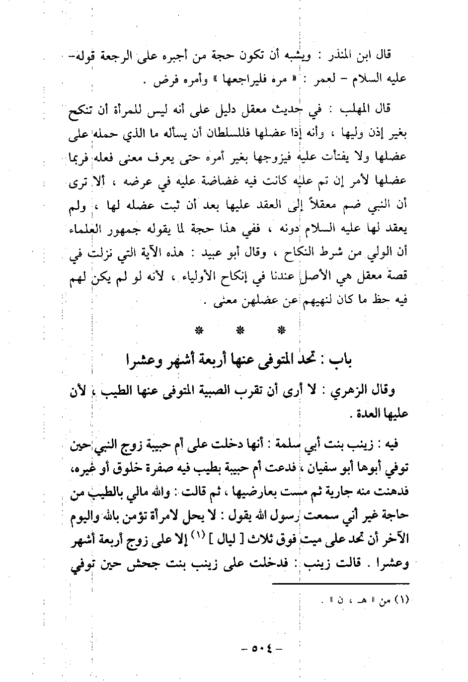 قال ابن المنذر: ويشبه أن تكون حجة من أجبره على الرجعة قوله، عليه السلام، لعمر: (مره فليراجعها) ، وأمره فرض. قال المهلب: فى حديث معقل دليل على أنه ليس للمرأة أن تنكح بغير إذن وليها، وأنه إذا عضلها فللسلطان أن يسأله ما الذى حمله على عضلها، ولا يفتأت عليه فيزوجها بغير أمره حتى يعرف معنى فعله، فربما عضلها لأمر إن تم عليه كانت فيه غضاضة عليه فى عرضه، ألا ترى أن النبى (صلى الله عليه وسلم) ضم معقلاً إلى العقد عليها بعد أن ثبت عضله لها، ولم يعقد لها، عليه السلام، دونه، ففى هذا حجة لما يقوله جمهور العلماء أن الولى من شرط النكاح. وقال أبو عبيد: هذه الآية التى نزلت فى قصة معقل هى الأصل عندنا فى إنكاح الأولياء؛ لأنه لو لم يكن لهم فيه حظ، ما كان لنهيهم عن عضلهن معنى.