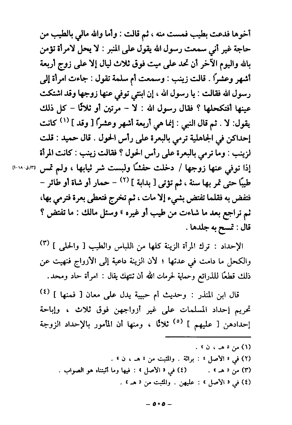 أَخُوهَا، فَدَعَتْ بِطِيبٍ فَمَسَّتْ مِنْهُ، ثُمَّ قَالَتْ: أَمَا وَاللَّهِ مَا لِى بِالطِّيبِ مِنْ حَاجَةٍ، غَيْرَ أَنِّى سَمِعْتُ رَسُولَ اللَّهِ (صلى الله عليه وسلم) يَقُولُ عَلَى الْمِنْبَرِ: (لا يَحِلُّ لامْرَأَةٍ تُؤْمِنُ بِاللَّهِ وَالْيَوْمِ الآخِرِ أَنْ تُحِدَّ عَلَى مَيِّتٍ فَوْقَ ثَلاثِ لَيَالٍ، إِلا عَلَى زَوْجٍ أَرْبَعَةَ أَشْهُرٍ وَعَشْرًا) . قَالَتْ زَيْنَبُ: وَسَمِعْتُ أُمَّ سَلَمَةَ، تَقُولُ: جَاءَتِ امْرَأَةٌ إِلَى رَسُولِ اللَّهِ (صلى الله عليه وسلم) ، فَقَالَتْ: يَا رَسُولَ اللَّهِ، إِنَّ ابْنَتِى تُوُفِّىَ عَنْهَا زَوْجُهَا، وَقَدِ اشْتَكَتْ عَيْنَهَا، أَفَتَكْحُلُهَا؟ فَقَالَ رَسُولُ اللَّهِ (صلى الله عليه وسلم) : (لا) ، مَرَّتَيْنِ أَوْ ثَلاثًا، كُلَّ ذَلِكَ يَقُولُ: (لا) ، ثُمَّ قَالَ رَسُولُ اللَّهِ (صلى الله عليه وسلم) : (إِنَّمَا هِىَ أَرْبَعَةُ أَشْهُرٍ وَعَشْرٌ، وَقَدْ كَانَتْ إِحْدَاكُنَّ فِى الْجَاهِلِيَّةِ تَرْمِى بِالْبَعْرَةِ عَلَى رَأْسِ الْحَوْلِ؟) . قَالَ حُمَيْدٌ: فَقُلْتُ لِزَيْنَبَ: وَمَا تَرْمِى بِالْبَعْرَةِ عَلَى رَأْسِ الْحَوْلِ؟ فَقَالَتْ زَيْنَبُ: كَانَتِ الْمَرْأَةُ إِذَا تُوُفِّىَ عَنْهَا زَوْجُهَا، دَخَلَتْ حِفْشًا، وَلَبِسَتْ شَرَّ ثِيَابِهَا، وَلَمْ تَمَسَّ طِيبًا حَتَّى تَمُرَّ بِهَا سَنَةٌ، ثُمَّ تُؤْتَى بِدَابَّةٍ حِمَارٍ، أَوْ شَاةٍ، أَوْ طَائِرٍ، فَتَفْتَضُّ بِهِ، فَقَلَّمَا تَفْتَضُّ بِشَىْءٍ إِلا مَاتَ، ثُمَّ تَخْرُجُ، فَتُعْطَى بَعَرَةً، فَتَرْمِى بَهَا، ثُمَّ تُرَاجِعُ بَعْدُ مَا شَاءَتْ مِنْ طِيبٍ أَوْ غَيْرِهِ. وسُئِلَ مَالِكٌ مَا تَفْتَضُّ بِهِ؟ قَالَ: تَمْسَحُ بِهِ جِلْدَهَا. الإحداد ترك المرأة الزينة كلها من اللباس، والطيب، والحلى، والكحل، ما دامت فى عدتها؛ لأن الزينة داعية إلى الأزواج، فنهيت عن ذلك قطعًا للذرائع وحماية لحرمات الله أن تنتهك، يقال: امرأة حاد ومحد. قال ابن المنذر: وحديث أم حبيبة يدل على معان، فمنها: تحريم إحداد المسلمات على غير أزواجهن فوق ثلاث، وإباحة إحدادهن عليهم ثلاثًا، ومنها أن المأمور بالإحداد الزوجة