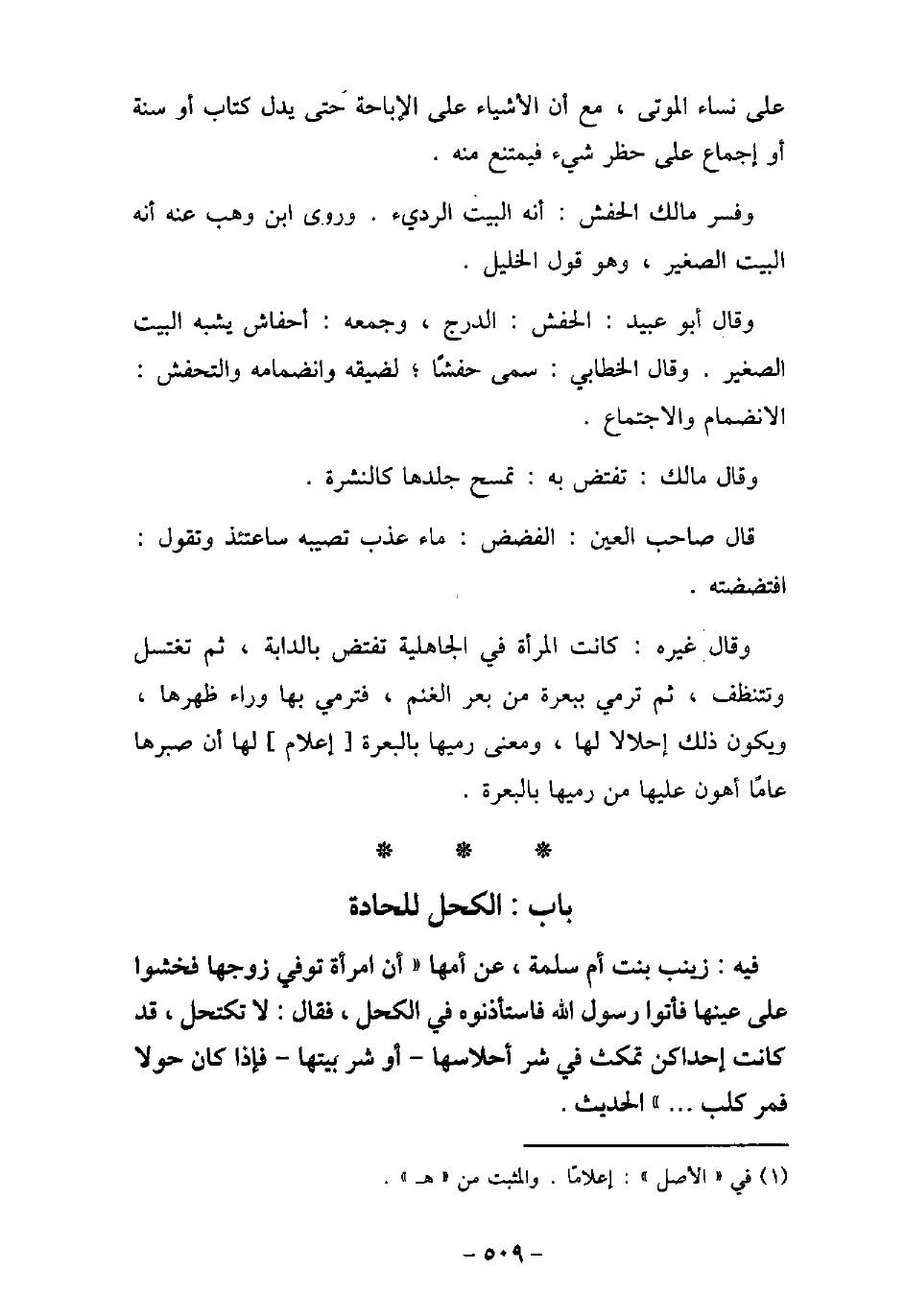 على نساء الموتى، مع أن الأشياء على الإباحة حتى يدل كتاب أو سنة أو إجماع على حظر شىء فيمتنع منه. وفسر مالك الحفش أنه البيت الردىء، وروى ابن وهب عنه أنه البيت الصغير، وهو قول الخليل. وقال أبو عبيد: الحفش الدرج، وجمعه أحفاش، يشبه البيت الصغير. وقال الخطابى: سمى حفشًا؛ لضيقه وانضمامه، والتحفش الانضمام والاجتماع. وقال مالك: تفتض به، تمسح جلدها كالنشرة. قال صاحب العين: الفضض ماء عذب تصيبه ساعتئذ، وتقول: افتضضته. وقال غيره: كانت المرأة فى الجاهلية تفتض بالدابة، ثم تغتسل وتتنظف، ثم ترمى ببعرة من بعر الغنم، فترمى بها وراء ظهرها، ويكون ذلك إحلالاً لها، ومعنى رميها بالبعرة إعلام لها أن صبرها عامًا أهون عليها من رميها بالبعرة.
