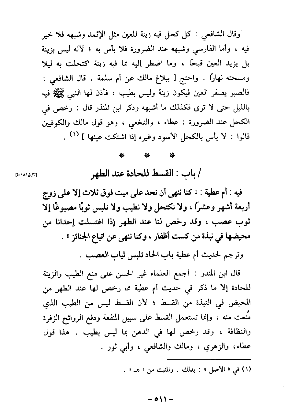 / 12 - فيه: أُمِّ عَطِيَّةَ، كُنَّا نُنْهَى أَنْ نُحِدَّ عَلَى مَيِّتٍ فَوْقَ ثَلاثٍ إِلا عَلَى زَوْجٍ أَرْبَعَةَ أَشْهُرٍ وَعَشْرًا، وَلا نَكْتَحِلَ، وَلا نَطَّيَّبَ، وَلا نَلْبَسَ ثَوْبًا مَصْبُوغًا إِلا ثَوْبَ عَصْبٍ، وَقَدْ رُخِّصَ لَنَا عِنْدَ الطُّهْرِ، إِذَا اغْتَسَلَتْ إِحْدَانَا مِنْ مَحِيضِهَا فِى نُبْذَةٍ مِنْ كُسْتِ أَظْفَارٍ، وَكُنَّا نُنْهَى عَنِ اتِّبَاعِ الْجَنَائِزِ. وترجم لحديث أم عطية: (باب الحاد تلبس ثياب العصب) . قال ابن المنذر: أجمع العلماء غير الحسن على منع الطيب والزينة للحادة إلا ما ذكر فى حديث أم عطية مما رخص لها عند الطهر من المحيض فى النبذة من القسط؛ لأن القسط ليس من الطيب الذى منعت منه، وإنما تستعمل القسط على سبيل المنفعة ودفع الروائح الزفرة والنظافة، وقد رخص لها فى الدهن بما ليس بطيب، هذا قول عطاء، والزهرى، ومالك، والشافعى، وأبى ثور.