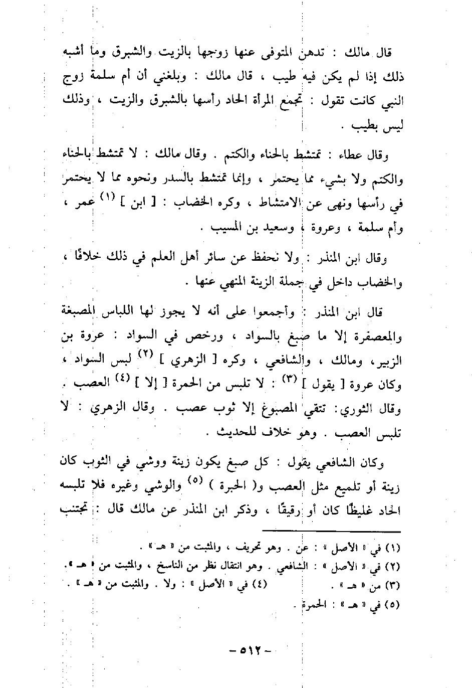 قال مالك: تدهن المتوفى عنها زوجها بالزيت والشبرق وما أشبه ذلك إذا لم يكن فيه طيب. قال مالك: وبلغنى أن أم سلمة زوج النبى (صلى الله عليه وسلم) كانت تقول: تجمع المرأة الحاد رأسها بالشبرق والزيت، وذلك ليس بطيب. وقال عطاء: تمتشط بالحناء والكتم. وقال مالك: لا تمتشط بالحناء والكتم ولا بشىء مما يحتمر، وإنما تمتشط بالسدر ونحوه مما لا يحتمر فى رأسها، ونهى عن الامتشاط، وكره الخضاب ابن عمر، وأم سلمة، وعروة، وسعيد بن المسيب. وقال ابن المنذر: ولا نحفظ عن سائر أهل العلم فى ذلك خلافًا، والخضاب داخل فى جملة الزينة المنهى عنها. قال ابن المنذر: وأجمعوا على أنه لا يجوز لها اللباس المصبغة والمعصفرة إلا ما صبغ بالسواد، ورخص فى السواد عروة بن الزبير، ومالك، والشافعى، وكره الزهرى لبس السواد، وكان عروة يقول: لا تلبس من الحمرة إلا العصب. وقال الثورى: تتقى المصبوغ إلا ثوب عصب. وقال الزهرى: لا تلبس العصب، وهو خلاف للحديث. وكان الشافعى يقول: كل صبغ يكون زينة ووشى فى الثوب كان زينة أو تلميع مثل العصب والحبرة والوشى وغيره، فلا تلبسه الحاد، غليظًا كان أو رقيقًا، وذكر ابن المنذر عن مالك، قال: تجتنب