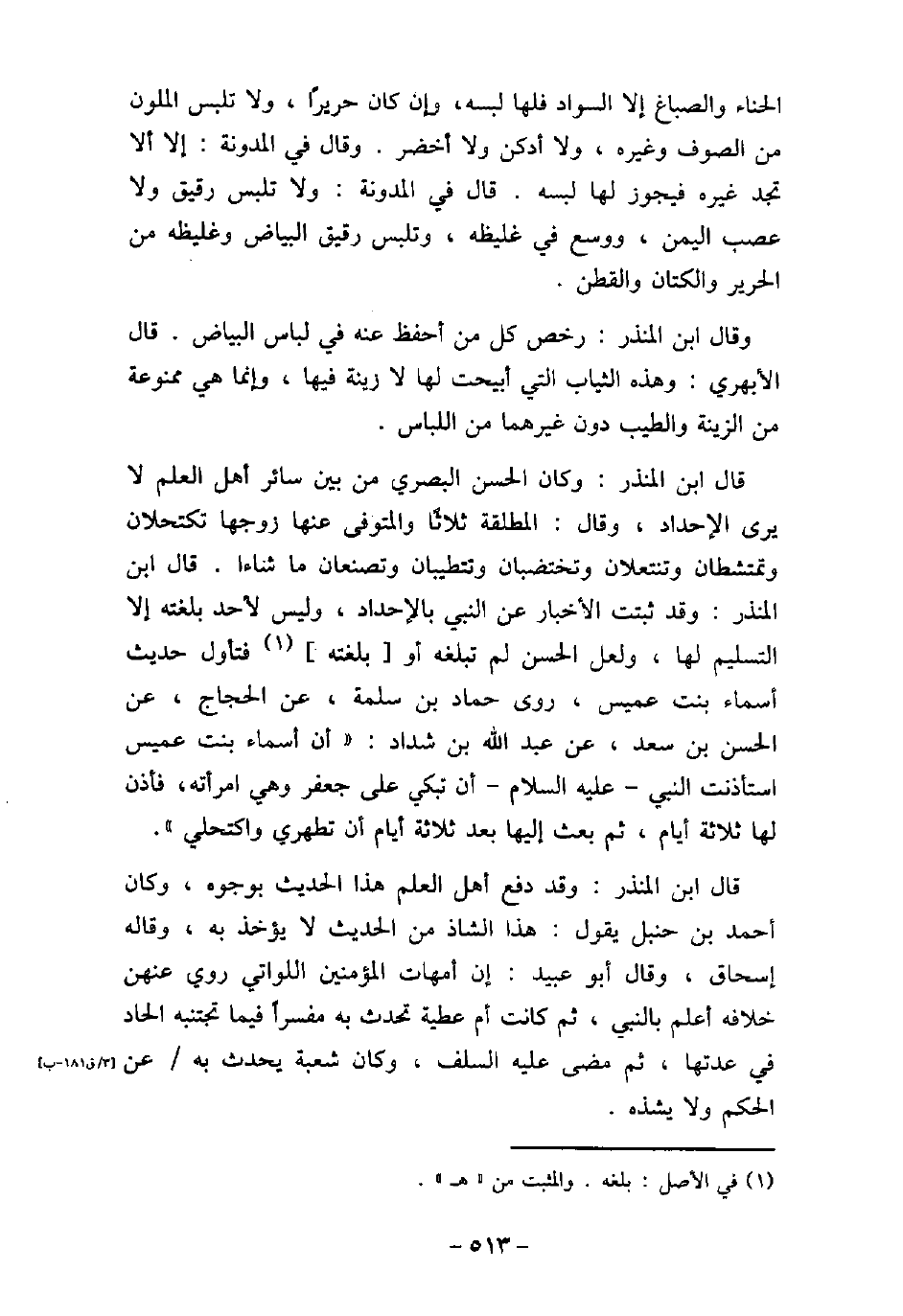 الحناء والصباغ إلا السواد، فلها لبسه، وإن كان حريرًا، ولا تلبس الملون من الصوف وغيره، ولا أدكن ولا أخضر. وقال فى المدونة: إلا أن تجد غيره، فيجوز لها لبسه. قال فى المدونة: ولا تلبس رقيق ولا عصب اليمن، ووسع فى غليظه، وتلبس رقيق البياض وغليظه من الحرير والكتان والقطن. وقال ابن المنذر: رخص كل من أحفظ عنه فى لباس البياض. قال الأبهرى: وهذه الثياب التى أبيحت لها لا زينة فيها، وإنما هى ممنوعة من الزينة والطيب دون غيرهما من اللباس. قال ابن المنذر: وكان الحسن البصرى من بين سائر أهل العلم لا يرى الإحداد، وقال: المطلقة ثلاثًا والمتوفى عنها زوجها تكتحلان وتمتشطان وتنتعلان وتختضبان وتتطيبان وتصنعان ما شاءا. قال ابن المنذر: وقد ثبتت الأخبار عن النبى (صلى الله عليه وسلم) بالإحداد، وليس لأحد بلغته إلا التسليم بها، ولعل الحسن لم تبلغه أو بلغته، فتأول حديث أسماء بنت عميس، روى حماد بن سلمة، عن الحجاج، عن الحسن بن سعد، عن عبد الله بن شداد، أن أسماء بنت عميس استأذنت النبى، عليه السلام، أن تبكى على جعفر وهى امرأته، فأذن لها ثلاثة أيام، ثم بعث إليها بعد ثلاثة أيام أن تطهرى واكتحلى. قال ابن المنذر: وقد دفع أهل العلم هذا الحديث بوجوه، وكان أحمد بن حنبل يقول: هذا الشاذ من الحديث لا يؤخذ به، وقاله إسحاق. وقال أبو عبيد: إن أمهات المؤمنين اللواتى روى عنهن خلافه أعلم بالنبى (صلى الله عليه وسلم) ، ثم كانت أم عطية تحدث به مفسرًا فيما تجتنبه الحاد فى عدتها، ثم مضى عليه السلف، وكان شعبة يحدث به عن الحكم ولا يشذه.