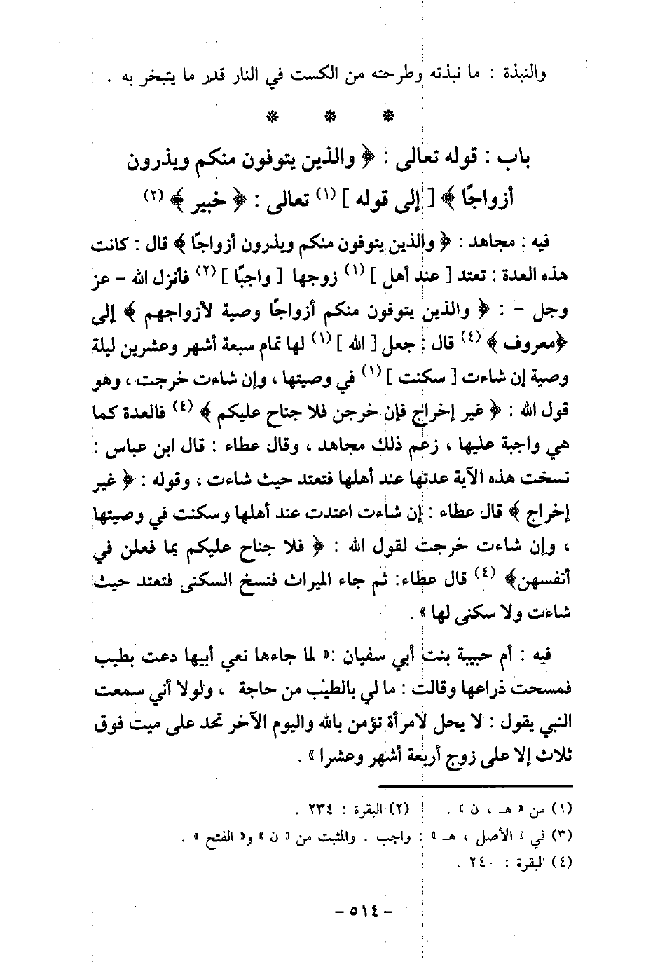 - بَاب قوله تَعَالَى: (وَالَّذِينَ يُتَوَفَّوْنَ مِنْكُمْ وَيَذَرُونَ أَزْوَاجًا (إِلَى قَوْلِهِ: (خَبِيرٌ) [البقرة: 234]