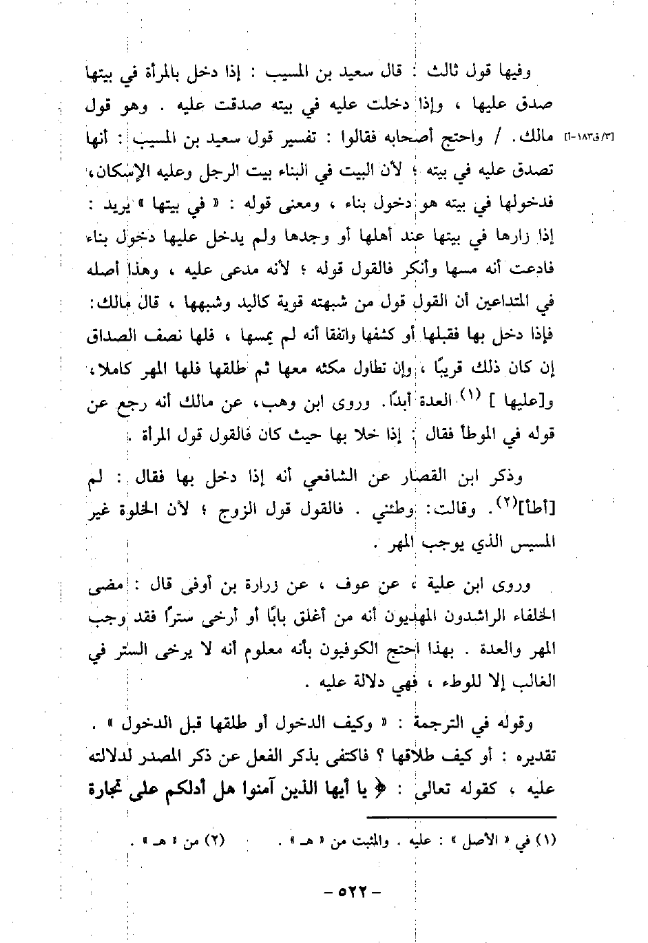 وفيها قول ثالث: قال سعيد بن المسيب: إذا دخل بالمرأة فى بيتها صدق عليها، وإذا دخلت عليه فى بيته صدقت عليه، وهو قول مالك، واحتج أصحابه، فقالوا: تفسير قول سعيد بن المسيب أنها تصدق عليه فى بيته؛ لأن البيت فى البناء بيت الرجل وعليه الإسكان، فدخلوها فى بيته هو دخول بناء، ومعنى قوله: (فى بيتها) ، يريد إذا زارها فى بيتها عند أهلها أو وجدها ولم يدخل عليها دخول بناء، فادعت أنه مسها وأنكر فالقول قوله؛ لأنه مدعى عليه، وهذا أصله فى المتداعين أن القول قول من شبهته قوية كاليد وشبهها. قال مالك: فإذا دخل بها فقبلها أو كشفها واتفقا أنه لم يمسها، فلها نصف الصداق إن كان ذلك قريبًا، وإن تطاول مكثه معها ثم طلقها، فلها المهر كاملاً، وعليها العدة أبدًا. وروى ابن وهب، عن مالك أنه رجع عن قوله فى الموطأ، فقال: إذا خلا بها حيث كان فالقول قول المرأة. وذكر ابن القصار عن الشافعى أنه إذا دخل بها، فقال: لم أطأ، وقالت: وطئنى، فالقول قول الزوج؛ لأن الخلوة غير المسيس الذى يوجب المهر. وروى ابن علية، عن عوف، عن زرارة بن أوفى، قال: مضى الخلفاء الراشدون المهديون أنه من أغلق بابًا أو أرخى سترًا فقد وجب المهر والعدة، بهذا احتج الكوفيون بأنه معلوم أنه لا يرخى الستر فى الغالب إلا للوطء، فهى دلالة عليه. وقوله فى الترجمة: وكيف الدخول أو طلقها قبل الدخول، تقديره: أو كيف طلاقها؟ فاكتفى بذكر الفعل عن ذكر المصدر لدلالته عليه، كقوله تعالى: (يا أيها الذين آمنوا هل أدلكم على تجارة