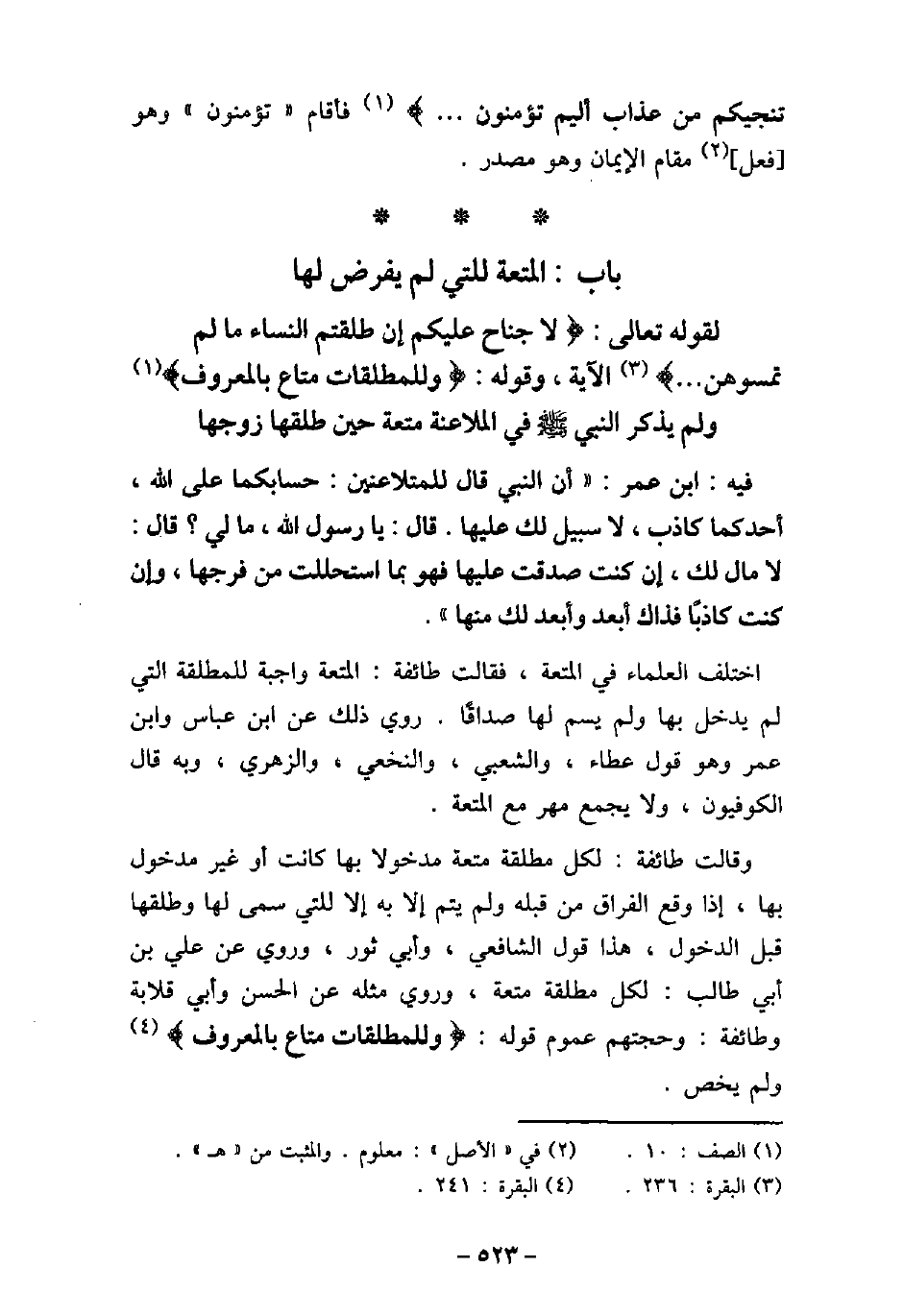لِقَوْلِهِ تَعَالَى: (لا جُنَاحَ عَلَيْكُمْ إِنْ طَلَّقْتُمُ النِّسَاءَ مَا لَمْ تَمَسُّوهُنَّ) [البقرة: 236] الآية، وَقَوْلِهِ: (وَلِلْمُطَلَّقَاتِ مَتَاعٌ بِالْمَعْرُوفِ) [البقرة: 241] وَلَمْ يَذْكُرِ النَّبِىُّ (صلى الله عليه وسلم) فِى الْمُلاعَنَةِ مُتْعَةً حِينَ طَلَّقَهَا زَوْجُهَا / 17 - فيه: ابْن عُمَر: أَنَّ النَّبِىَّ (صلى الله عليه وسلم) قَالَ لِلْمُتَلاعِنَيْنِ: (حِسَابُكُمَا عَلَى اللَّهِ، أَحَدُكُمَا كَاذِبٌ، لا سَبِيلَ لَكَ عَلَيْهَا) . قَالَ: يَا رَسُولَ اللَّهِ، مَالِى؟ قَالَ: (لا مَالَ لَكَ، إِنْ كُنْتَ صَدَقْتَ عَلَيْهَا، فَهُوَ بِمَا اسْتَحْلَلْتَ مِنْ فَرْجِهَا، وَإِنْ كُنْتَ كَاذِبًا، فَذَاكَ أَبْعَدُ وَأَبْعَدُ لَكَ مِنْهَا) . اختلف العلماء فى المتعة، فقالت طائفة: المتعة واجبة للمطلقة التى لم يدخل بها ولم يسم لها صداقًا، روى ذلك عن ابن عباس، وابن عمر، وهو قول عطاء، والشعبى، والنخعى، والزهرى، وبه قال الكوفيون، ولا يجمع مهر مع المتعة. وقالت طائفة: لكل مطلقة متعة مدخولاً بها كانت أو غير مدخول بها، إذا وقع الفراق من قبله ولم يتم إلا به إلا للتى سمى لها وطلقها قبل الدخول، هذا قول الشافعى، وأبى ثور، وروى عن على بن أبى طالب: لكل مطلقة متعة، وروى مثله عن الحسن، وأبى قلابة، وطائفة، وحجتهم عموم قوله: (وللمطلقات متاع بالمعروف) [البقرة: 241] ، ولم يخص.