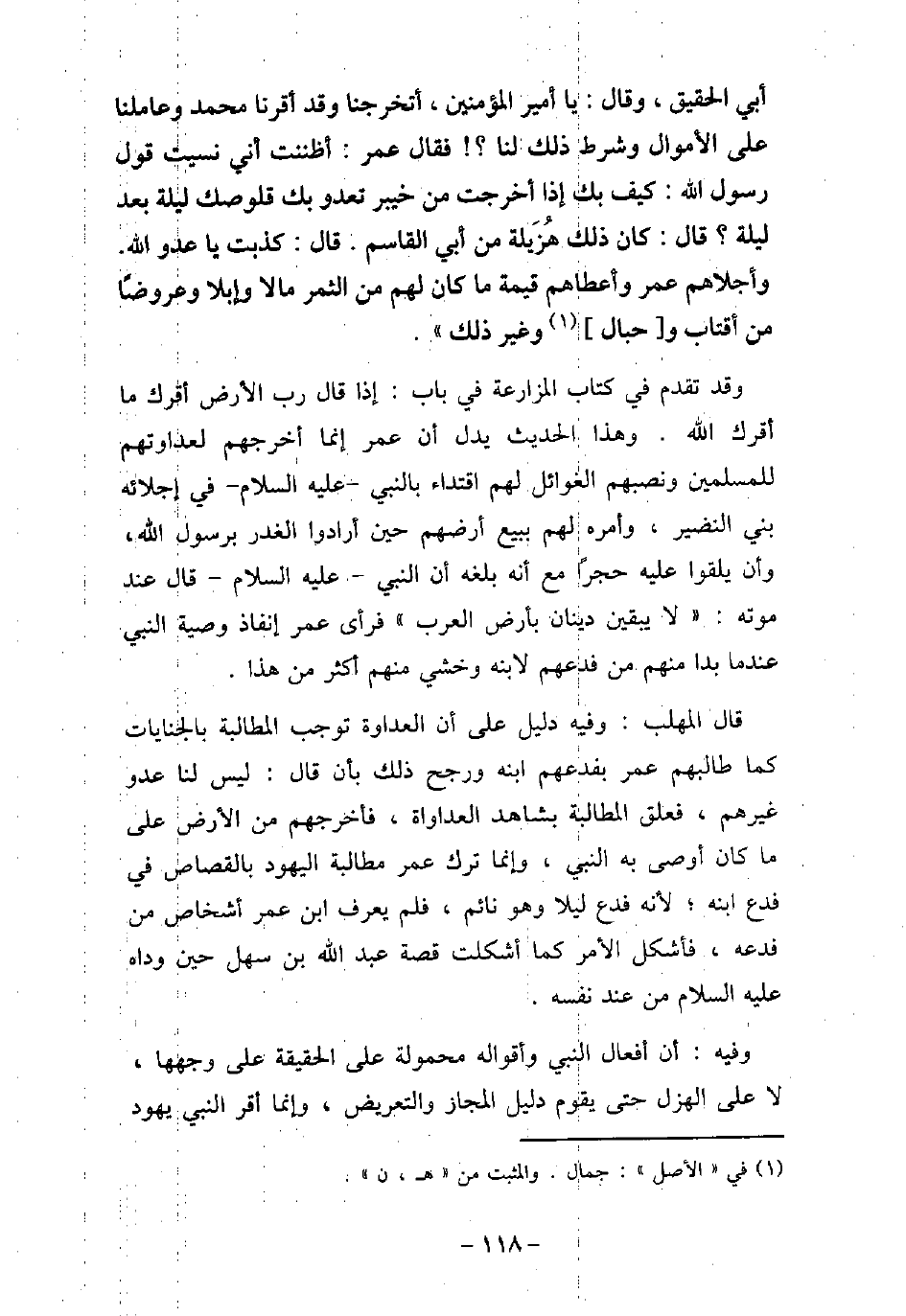 أَبِى الْحُقَيْقِ، فَقَالَ: يَا أَمِيرَ الْمُؤْمِنِينَ أَتُخْرِجُنَا، وَقَدْ أَقَرَّنَا مُحَمَّدٌ (صلى الله عليه وسلم) ، وَعَامَلَنَا عَلَى الأمْوَالِ وَشَرَطَ ذَلِكَ لَنَا، فَقَالَ عُمَرُ: أَظَنَنْتَ أَنِّى نَسِيتُ قَوْلَ رَسُولِ اللَّهِ (صلى الله عليه وسلم) : كَيْفَ بِكَ إِذَا أُخْرِجْتَ مِنْ خَيْبَرَ، تَعْدُو بِكَ قَلُوصُكَ لَيْلَةً بَعْدَ لَيْلَةٍ؟ فَقَالَ: كَانَتْ هَذِهِ هُزَيْلَةً مِنْ أَبِى الْقَاسِمِ، قَالَ: كَذَبْتَ يَا عَدُوَّ اللَّهِ، فَأَجْلاهُمْ عُمَرُ، وَأَعْطَاهُمْ قِيمَةَ مَا كَانَ لَهُمْ مِنَ الثَّمَرِ مَالا وَإِبِلا وَعُرُوضًا مِنْ أَقْتَابٍ وَحِبَالٍ وَغَيْرِ ذَلِكَ. وقد تقدم فى كتاب المزارعة فى باب: إذا قال رب الأرض أقرك ما أقرك الله. وهذا الحديث يدل أن عمر إنما أخرجهم لعداوتهم للمسلمين ونصبهم الغوائل لهم اقتداء بالنبى (صلى الله عليه وسلم) فى إجلائه بنى النضير، وأمره لهم ببيع أرضهم حين أرادوا الغدر برسول الله (صلى الله عليه وسلم) ، وأن يلقوا عليه حجرًا مع أنه بلغه أن النبى (صلى الله عليه وسلم) قال عند موته: (لا يبقين دينان بأرض العرب) فرأى عمر إنفاذ وصية النبى (صلى الله عليه وسلم) عندما بدا منهم من فدعهم لابنه وخشى منهم أكثر من هذا. قال المهلب: وفيه دليل على أن العداوة توجب المطالبة بالجنايات كما طالبهم عمر بفدعهم ابنه ورجح ذلك بأن قال: ليس لنا عدو غيرهم، فعلق المطالبة بشاهد العداوة، فأخرجهم من الأرض على ما كان أوصى به النبى (صلى الله عليه وسلم) ، وإنما ترك عمر مطالبة اليهود بالقصاص فى فدع ابنه؛ لأنه فدع ليلا وهو نائم، فلم يعرف ابن عمر أشخاص من فدعه، فأشكل الأمر كما أشكلت قصة عبد الله بن سهل حين وداه (صلى الله عليه وسلم) من عند نفسه. وفيه: أن أفعال النبى (صلى الله عليه وسلم) وأقواله محمولة على الحقيقة على وجهها، لا على الهزل حتى يقوم دليل المجاز والتعريض، وإنما أقر النبى (صلى الله عليه وسلم) يهود