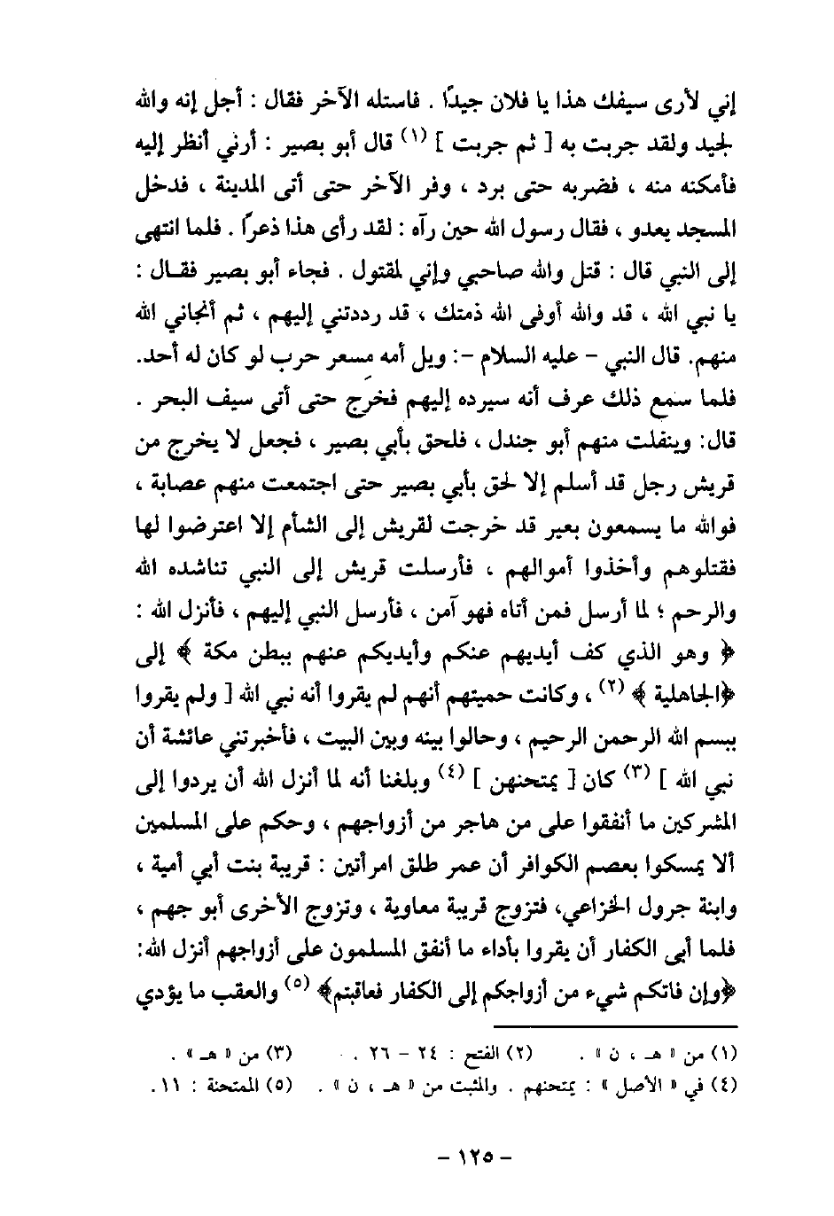 إِنِّى لأرَى سَيْفَكَ هَذَا يَا فُلانُ جَيِّدًا، فَاسْتَلَّهُ الْآخَرُ، فَقَالَ: أَجَلْ وَاللَّهِ إِنَّهُ لَجَيِّدٌ لَقَدْ جَرَّبْتُ بِهِ، ثُمَّ جَرَّبْتُ، فَقَالَ أَبُو بَصِيرٍ: أَرِنِى، أَنْظُرْ إِلَيْهِ، فَأَمْكَنَهُ مِنْهُ فَضَرَبَهُ حَتَّى بَرَدَ وَفَرَّ الآخَرُ، حَتَّى أَتَى الْمَدِينَةَ، فَدَخَلَ الْمَسْجِدَ يَعْدُو، فَقَالَ رَسُولُ اللَّهِ (صلى الله عليه وسلم) : حِينَ رَآهُ لَقَدْ رَأَى هَذَا ذُعْرًا، فَلَمَّا انْتَهَى إِلَى النَّبِىِّ (صلى الله عليه وسلم) قَالَ: قُتِلَ وَاللَّهِ صَاحِبِى، وَإِنِّى لَمَقْتُولٌ، فَجَاءَ أَبُو بَصِيرٍ، فَقَالَ: يَا نَبِىَّ اللَّهِ، قَدْ وَاللَّهِ أَوْفَى اللَّهُ ذِمَّتَكَ قَدْ رَدَدْتَنِى إِلَيْهِمْ، ثُمَّ أَنْجَانِى اللَّهُ مِنْهُمْ، قَالَ النَّبِىُّ (صلى الله عليه وسلم) : وَيْلُ أُمِّهِ مِسْعَرَ حَرْبٍ، لَوْ كَانَ لَهُ أَحَدٌ، فَلَمَّا سَمِعَ ذَلِكَ عَرَفَ أَنَّهُ سَيَرُدُّهُ إِلَيْهِمْ، فَخَرَجَ حَتَّى أَتَى سِيفَ الْبَحْرِ، قَالَ: وَيَنْفَلِتُ مِنْهُمْ أَبُو جَنْدَلِ بْنُ سُهَيْلٍ، فَلَحِقَ بِأَبِى بَصِيرٍ، فَجَعَلَ لا يَخْرُجُ مِنْ قُرَيْشٍ رَجُلٌ قَدْ أَسْلَمَ إِلا لَحِقَ بِأَبِى بَصِيرٍ حَتَّى اجْتَمَعَتْ مِنْهُمْ عِصَابَةٌ، فَوَاللَّهِ مَا يَسْمَعُونَ بِعِيرٍ خَرَجَتْ لِقُرَيْشٍ إِلَى الشَّأْمِ إِلا اعْتَرَضُوا لَهَا، فَقَتَلُوهُمْ وَأَخَذُوا أَمْوَالَهُمْ، فَأَرْسَلَتْ قُرَيْشٌ إِلَى النَّبِىِّ (صلى الله عليه وسلم) تُنَاشِدُهُ بِاللَّهِ وَالرَّحِمِ، لَمَّا أَرْسَلَ فَمَنْ أَتَاهُ فَهُوَ آمِنٌ، فَأَرْسَلَ النَّبِىُّ (صلى الله عليه وسلم) إِلَيْهِمْ فَأَنْزَلَ اللَّهُ تَعَالَى: (وَهُوَ الَّذِى كَفَّ أَيْدِيَهُمْ عَنْكُمْ وَأَيْدِيَكُمْ عَنْهُمْ بِبَطْنِ مَكَّةَ) [الفتح: 24] إِلَى) الْجَاهِلِيَّةِ) [الفتح: 26] وَكَانَتْ حَمِيَّتُهُمْ أَنَّهُمْ لَمْ يُقِرُّوا أَنَّهُ نَبِىُّ اللَّهِ، وَلَمْ يُقِرُّوا بِ (بِسْم اللَّهِ الرَّحْمَنِ الرَّحِيمِ) وَحَالُوا بَيْنَهُ وَبَيْنَ الْبَيْتِ) . فَأَخْبَرَتْنِى عَائِشَةُ أَنَّ رَسُولَ اللَّهِ (صلى الله عليه وسلم) كَانَ يَمْتَحِنُهُنَّ، وَبَلَغْنَا أَنَّهُ لَمَّا أَنْزَلَ اللَّهُ تَعَالَى أَنْ يَرُدُّوا إِلَى الْمُشْرِكِينَ مَا أَنْفَقُوا عَلَى مَنْ هَاجَرَ مِنْ أَزْوَاجِهِمْ، وَحَكَمَ عَلَى الْمُسْلِمِينَ أَنْ لا يُمَسِّكُوا بِعِصَمِ الْكَوَافِرِ، أَنَّ عُمَرَ طَلَّقَ امْرَأَتَيْنِ: قَرِيبَةَ بِنْتَ أَبِى أُمَيَّةَ وَابْنَةَ جَرْوَلٍ الْخُزَاعِىِّ، فَتَزَوَّجَ قَرِيبَةَ مُعَاوِيَةُ، وَتَزَوَّجَ الأخْرَى أَبُو جَهْمٍ، فَلَمَّا أَبَى الْكُفَّارُ أَنْ يُقِرُّوا بِأَدَاءِ مَا أَنْفَقَ الْمُسْلِمُونَ عَلَى أَزْوَاجِهِمْ، أَنْزَلَ اللَّهُ تَعَالَى: (وَإِنْ فَاتَكُمْ شَيْءٌ مِنْ أَزْوَاجِكُمْ إِلَى الْكُفَّارِ فَعَاقَبْتُمْ) [الممتحنة: 11] وَالْعَقْبُ: مَا يُؤَدِّى
