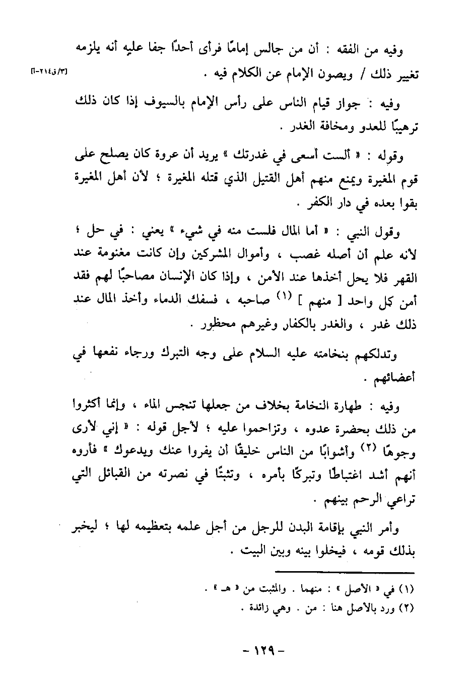وفيه من الفقه: أن من جالس إمامًا فرأى أحدًا جفا عليه أنه يلزمه تغيير ذلك ويصون الإمام عن الكلام فيه. وفيه: جواز قيام الناس على رأس الإمام بالسيوف إذا كان ذلك ترهيبًا للعدو ومخافة الغدر. وقوله: (ألست أسعى فى غدرتك) يريد أن عروة كان يصلح على قوم المغيرة ويمنع منهم أهل القتيل الذى قتله المغيرة؛ لأن أهل المغيرة بقوا بعده فى دار الكفر. وقول النبى (صلى الله عليه وسلم) : (أما المال فلست منه فى شىء) يعنى: فى حل؛ لأنه علم أن أصله غصب، وأموال المشركين وإن كانت مغنومة عند القهر فلا يحل أخذها عند الأمن، وإذا كان الإنسان مصاحبًا لهم فقد أمن كل واحد منهم صاحبه، فسفك الدماء وأخذ المال عند ذلك غدر، والغدر بالكفار وغيرهم محظور. وتدلكهم بنخامته (صلى الله عليه وسلم) على وجه التبرك ورجاء نفعها فى أعضائهم. وفيه: طهارة النخامة بخلاف من جعلها تنجس الماء، وإنما أكثروا من ذلك بحضرة عدوه، وتزاحموه عليه؛ لأجل قوله: (إنى لأرى وجوهًا وأشوابًا من الناس خليقًا أن يفروا عنك ويدعوك) فأروه أنهم أشد اغتباطًا وتبركًا بأمره، وتثبتًا فى نصرته من القبائل التى تراعى الرحم بينهم. وأمر النبى (صلى الله عليه وسلم) بإقامة البدن للرجل من أجل علمه بتعظيمه لها؛ ليخبر بذلك قومه، فيخلوا بينه وبين البيت.